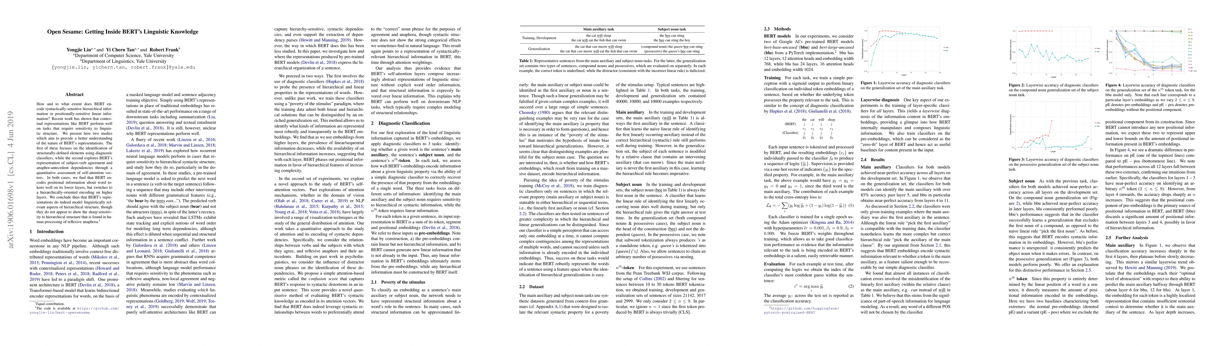 How and to what extent does BERT encode syntactically-sensitive hierarchical information or positionally-sensitive linear information? Recent work has shown that contextual representations like BERT perform well on tasks that require sensitivity to linguistic structure. We present here two studies which aim to provide a better understanding of the nature of BERT's representations. The first of these focuses on the identification of structurally-defined elements using diagnostic classifiers, while the second explores BERT's representation of subject-verb agreement and anaphor-antecedent dependencies through a quantitative assessment of self-attention vectors. In both cases, we find that BERT encodes positional information about word tokens well on its lower layers, but switches to a hierarchically-oriented encoding on higher layers. We conclude then that BERT's representations do indeed model linguistically relevant aspects of hierarchical structure, though they do not appear to show the sharp sensitivity to hierarchical structure that is found in human processing of reflexive anaphora.