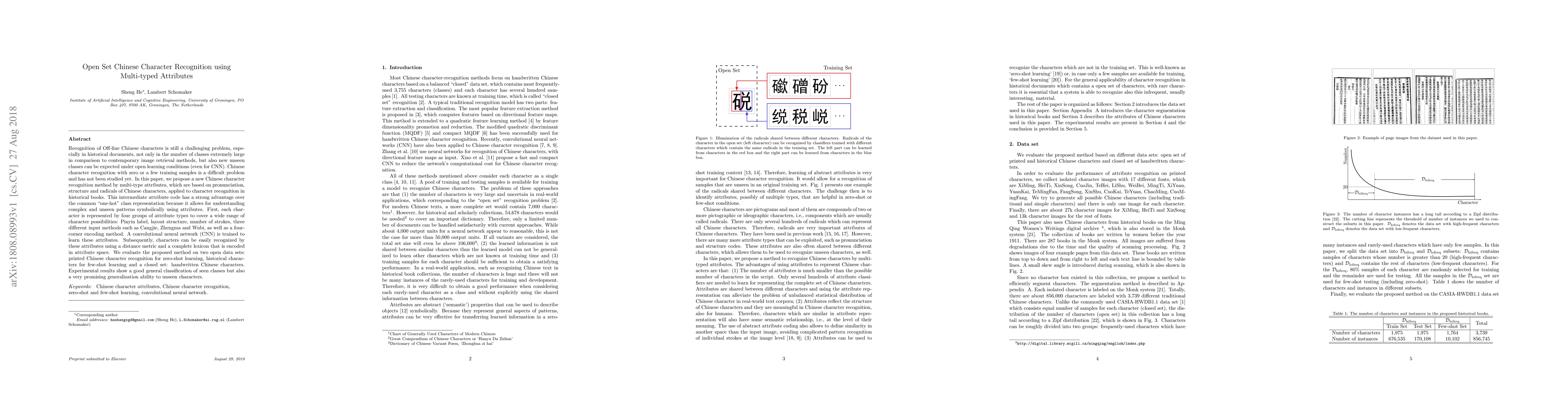 Recognition of Off-line Chinese characters is still a challenging problem, especially in historical documents, not only in the number of classes extremely large in comparison to contemporary image retrieval methods, but also new unseen classes can be expected under open learning conditions (even for CNN). Chinese character recognition with zero or a few training samples is a difficult problem and has not been studied yet. In this paper, we propose a new Chinese character recognition method by multi-type attributes, which are based on pronunciation, structure and radicals of Chinese characters, applied to character recognition in historical books. This intermediate attribute code has a strong advantage over the common `one-hot' class representation because it allows for understanding complex and unseen patterns symbolically using attributes. First, each character is represented by four groups of attribute types to cover a wide range of character possibilities: Pinyin label, layout structure, number of strokes, three different input methods such as Cangjie, Zhengma and Wubi, as well as a four-corner encoding method. A convolutional neural network (CNN) is trained to learn these attributes. Subsequently, characters can be easily recognized by these attributes using a distance metric and a complete lexicon that is encoded in attribute space. We evaluate the proposed method on two open data sets: printed Chinese character recognition for zero-shot learning, historical characters for few-shot learning and a closed set: handwritten Chinese characters. Experimental results show a good general classification of seen classes but also a very promising generalization ability to unseen characters.