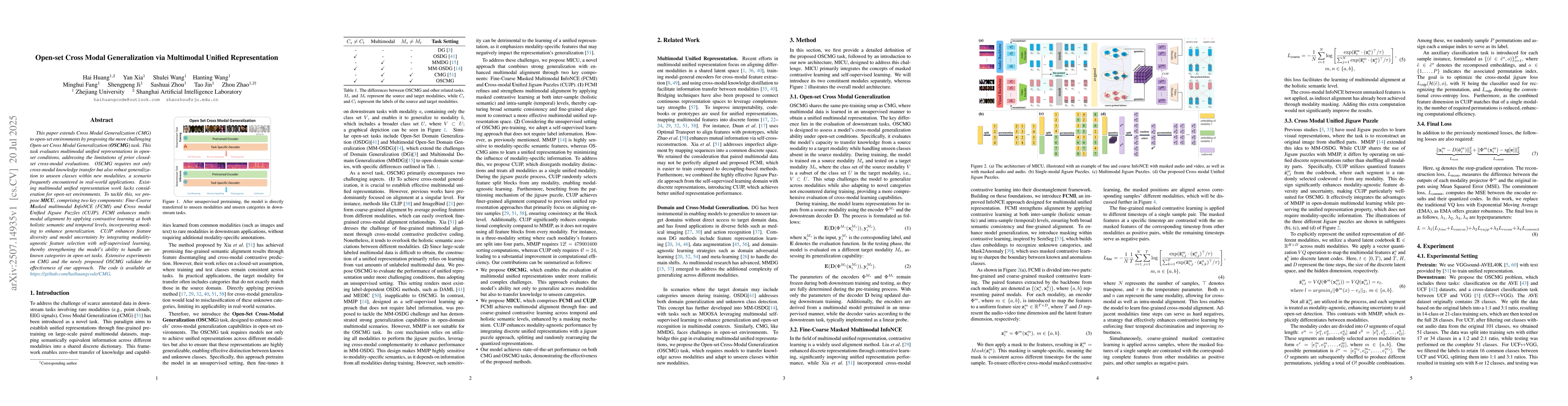 This paper extends Cross Modal Generalization (CMG) to open-set environments by proposing the more challenging Open-set Cross Modal Generalization (OSCMG) task. This task evaluates multimodal unified representations in open-set conditions, addressing the limitations of prior closed-set cross-modal evaluations. OSCMG requires not only cross-modal knowledge transfer but also robust generalization to unseen classes within new modalities, a scenario frequently encountered in real-world applications. Existing multimodal unified representation work lacks consideration for open-set environments. To tackle this, we propose MICU, comprising two key components: Fine-Coarse Masked multimodal InfoNCE (FCMI) and Cross modal Unified Jigsaw Puzzles (CUJP). FCMI enhances multimodal alignment by applying contrastive learning at both holistic semantic and temporal levels, incorporating masking to enhance generalization. CUJP enhances feature diversity and model uncertainty by integrating modality-agnostic feature selection with self-supervised learning, thereby strengthening the model's ability to handle unknown categories in open-set tasks. Extensive experiments on CMG and the newly proposed OSCMG validate the effectiveness of our approach. The code is available at https://github.com/haihuangcode/CMG.