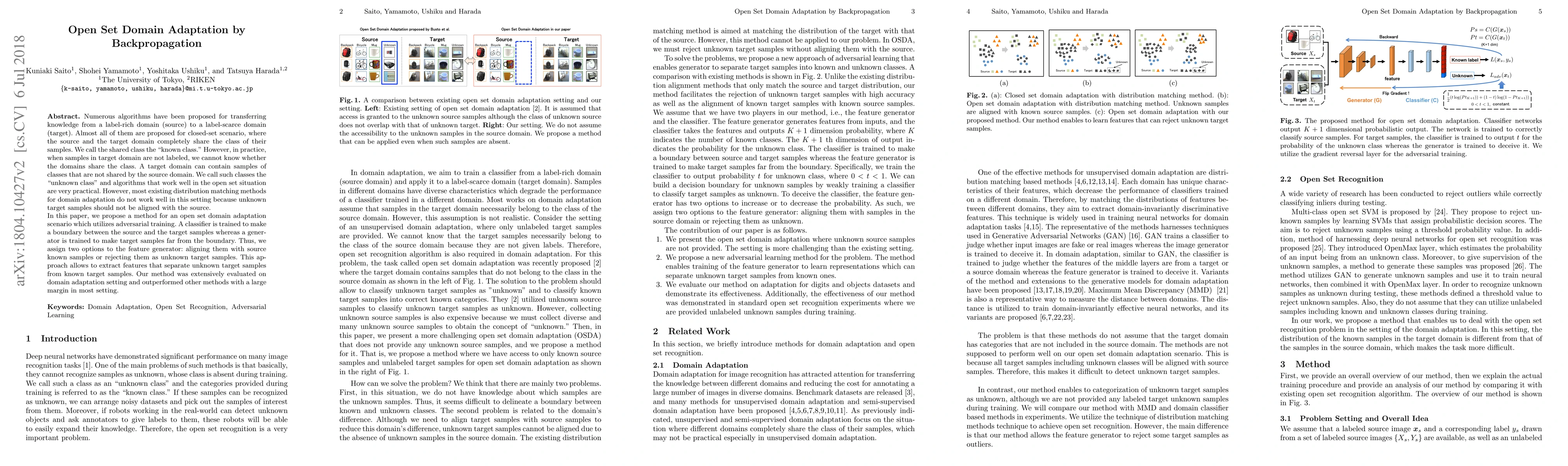 This paper proposes a novel open set domain adaptation method using adversarial training to distinguish between known and unknown classes in the target domain. The method trains a classifier to separate source and target samples while a generator pushes target samples away from the classifier boundary, effectively identifying unknown classes. The approach outperforms existing methods in domain adaptation tasks.