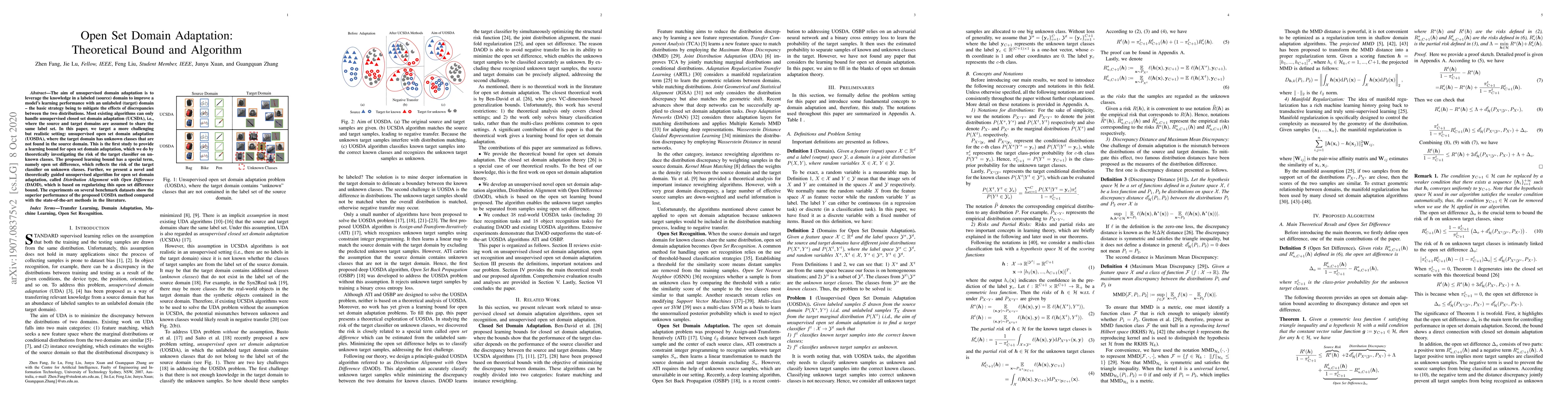 This paper introduces the first theoretical bound for unsupervised open set domain adaptation (UOSDA), addressing the challenge of unknown classes in the target domain. It proposes a novel algorithm, DAOD, based on minimizing an open set difference term, and demonstrates superior performance on benchmark datasets compared to existing methods.
