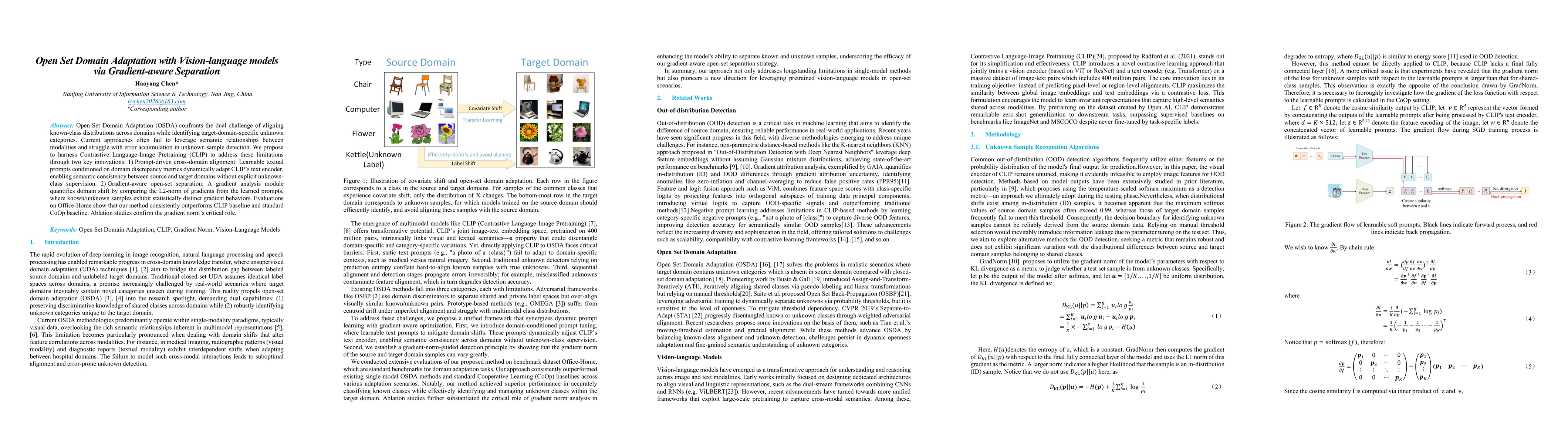 The research proposes using Contrastive Language-Image Pretraining (CLIP) with two innovations: (1) Prompt-driven cross-domain alignment adapts CLIP's text encoder via learnable textual prompts conditioned on domain discrepancy metrics, ensuring semantic consistency between source and target domains without explicit unknown-class supervision. (2) Gradient-aware open-set separation quantifies domain shift by comparing L2-norm of gradients from learned prompts, distinguishing known/unknown samples based on distinct gradient behaviors.