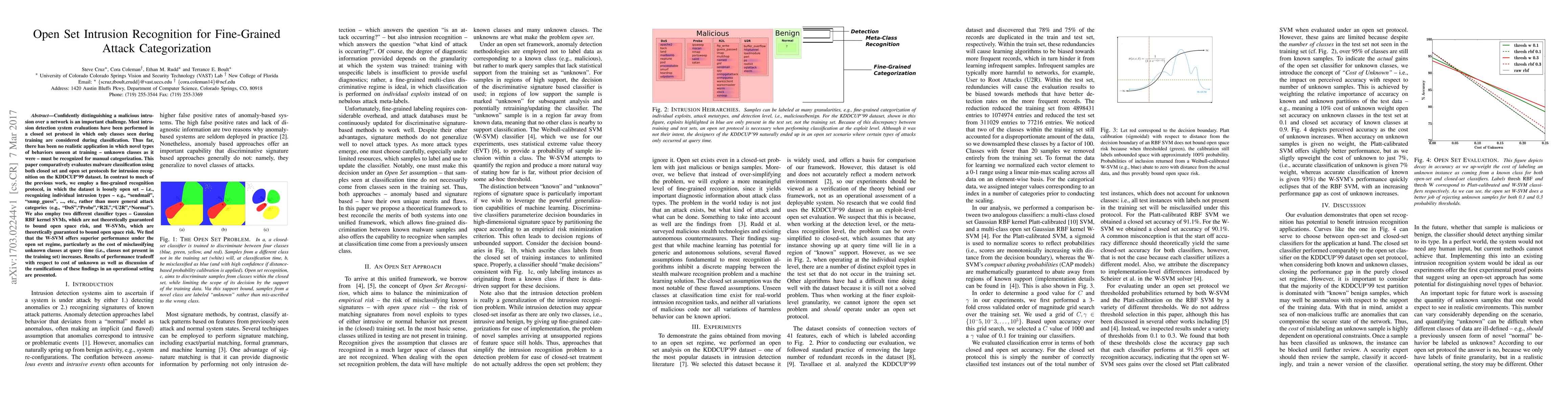 Confidently distinguishing a malicious intrusion over a network is an important challenge. Most intrusion detection system evaluations have been performed in a closed set protocol in which only classes seen during training are considered during classification. Thus far, there has been no realistic application in which novel types of behaviors unseen at training -- unknown classes as it were -- must be recognized for manual categorization. This paper comparatively evaluates malware classification using both closed set and open set protocols for intrusion recognition on the KDDCUP'99 dataset. In contrast to much of the previous work, we employ a fine-grained recognition protocol, in which the dataset is loosely open set -- i.e., recognizing individual intrusion types -- e.g., "sendmail", "snmp guess", ..., etc., rather than more general attack categories (e.g., "DoS","Probe","R2L","U2R","Normal"). We also employ two different classifier types -- Gaussian RBF kernel SVMs, which are not theoretically guaranteed to bound open space risk, and W-SVMs, which are theoretically guaranteed to bound open space risk. We find that the W-SVM offers superior performance under the open set regime, particularly as the cost of misclassifying unknown classes at query time (i.e., classes not present in the training set) increases. Results of performance tradeoff with respect to cost of unknown as well as discussion of the ramifications of these findings in an operational setting are presented.