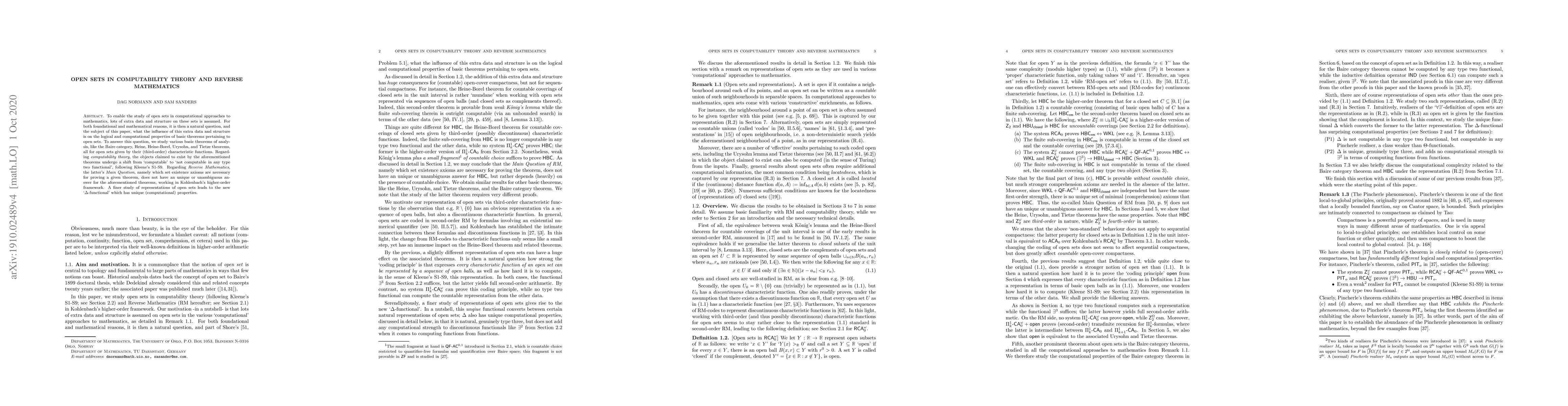 To enable the study of open sets in computational approaches to mathematics, lots of extra data and structure on these sets is assumed. For both foundational and mathematical reasons, it is then a natural question, and the subject of this paper, what the influence of this extra data and structure is on the logical and computational properties of basic theorems pertaining to open sets. To answer this question, we study various basic theorems of analysis, like the Baire category, Heine, Heine-Borel, Urysohn, and Tietze theorems, all for open sets given by their (third-order) characteristic functions. Regarding computability theory, the objects claimed to exist by the aforementioned theorems undergo a shift from `computable' to `not computable in any type two functional', following Kleene's S1-S9. Regarding Reverse Mathematics, the latter's so-called Main Question, namely which set existence axioms are necessary for proving a given theorem, does not have a unique or unambiguous answer for the aforementioned theorems, working in Kohlenbach's higher-order framework. A finer study of representations of open sets leads to the new `$\Delta$-functional' which has unique (computational) properties.