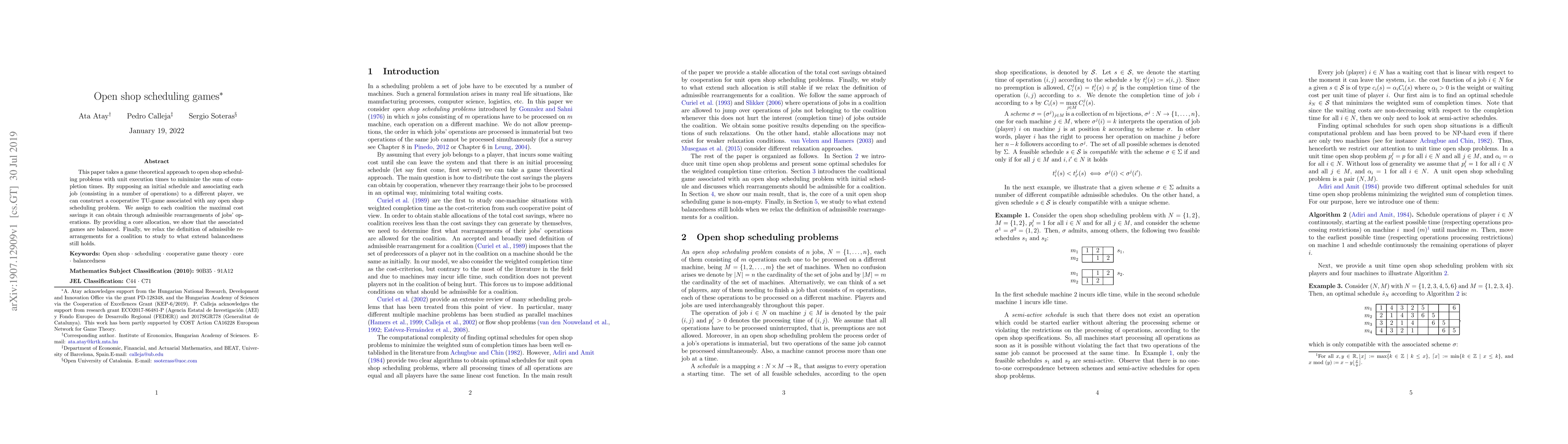 This paper uses game theory to tackle open shop scheduling problems with unit execution times, aiming to minimize total completion times. It constructs cooperative TU-games where each job's operations represent different players, and analyzes the core allocation to demonstrate balancedness under various rearrangements.