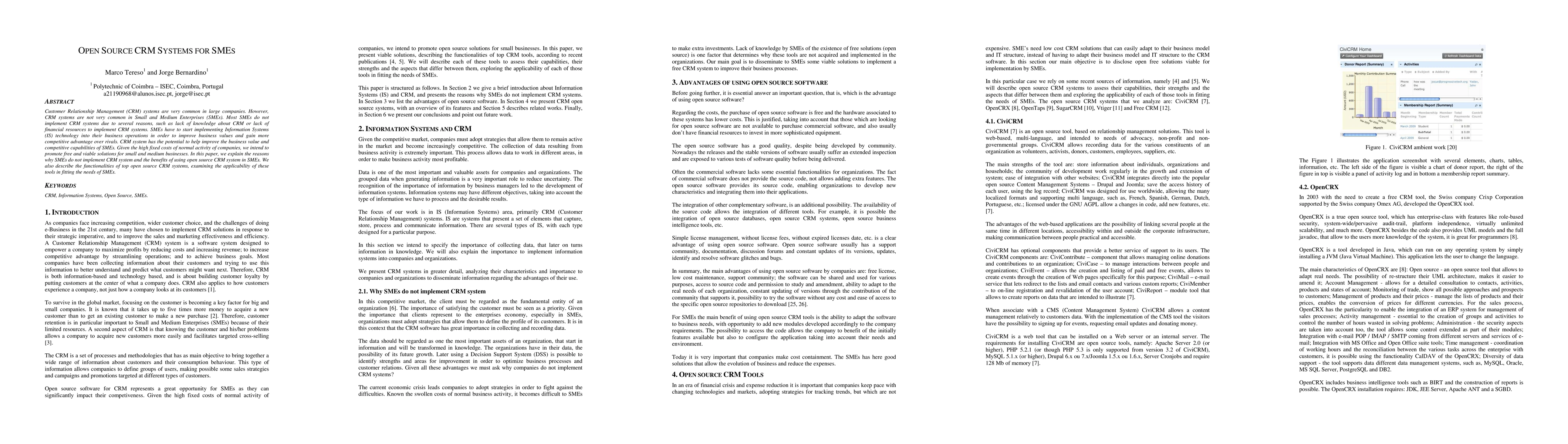 This paper explores the barriers preventing SMEs from adopting CRM systems and highlights the advantages of open-source CRM solutions. It examines the functionalities of leading open-source CRM systems to determine their suitability for SMEs' needs.