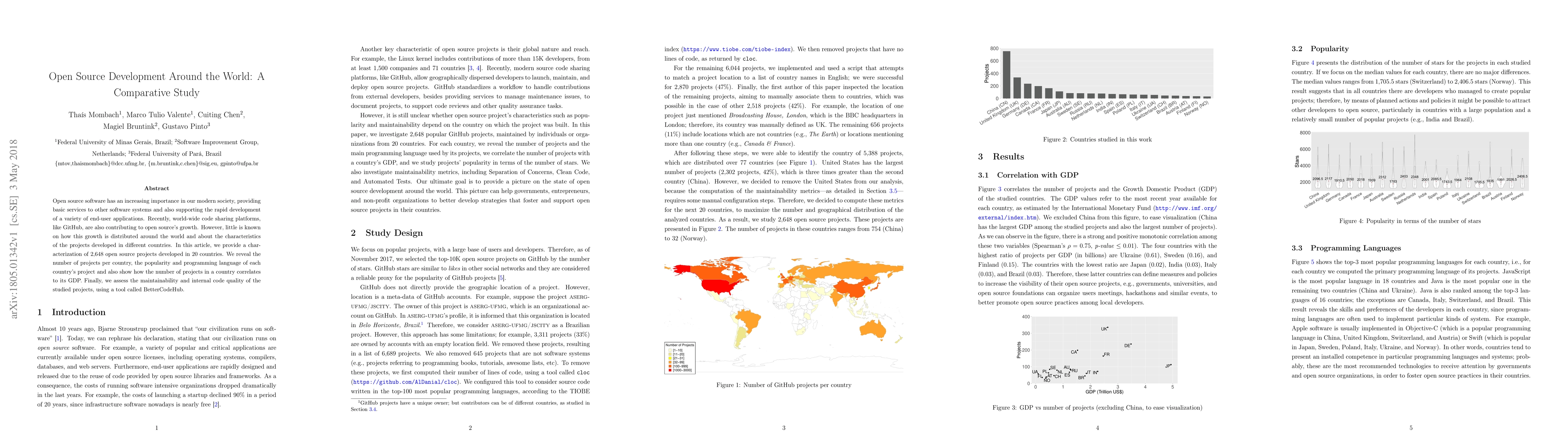 Open source software has an increasing importance in our modern society, providing basic services to other software systems and also supporting the rapid development of a variety of end-user applications. Recently, world-wide code sharing platforms, like GitHub, are also contributing to open source's growth. However, little is known on how this growth is distributed around the world and about the characteristics of the projects developed in different countries. In this article, we provide a characterization of 2,648 open source projects developed in 20 countries. We reveal the number of projects per country, the popularity and programming language of each country's project and also show how the number of projects in a country correlates to its GDP. Finally, we assess the maintainability and internal code quality of the studied projects, using a tool called BetterCodeHub.