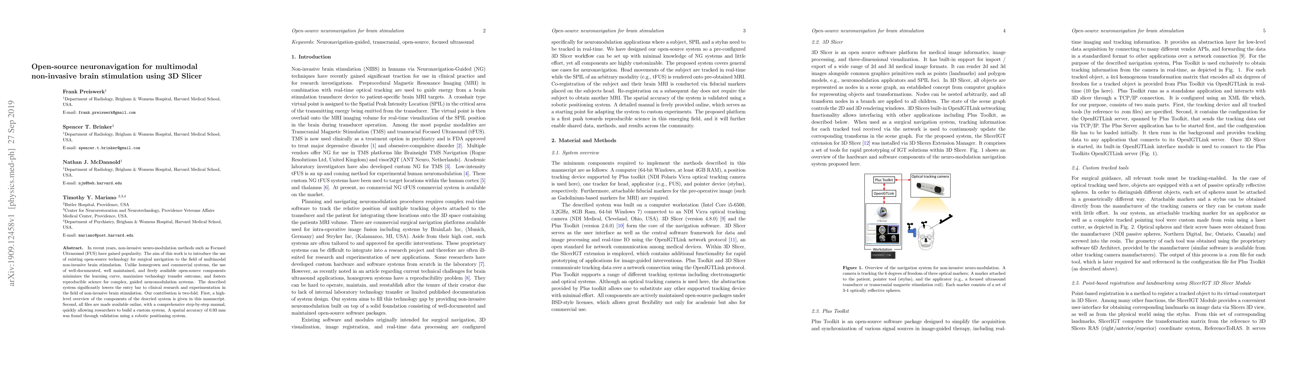 In recent years, non-invasive neuro-modulation methods such as Focused Ultrasound (FUS) have gained popularity. The aim of this work is to introduce the use of existing open-source technology for surgical navigation to the field of multimodal non-invasive brain stimulation. Unlike homegrown and commercial systems, the use of well-documented, well maintained, and freely available open-source components minimizes the learning curve, maximizes technology transfer outcome, and fosters reproducible science for complex, guided neuromodulation systems. The described system significantly lowers the entry bar to clinical research and experimentation in the field of non-invasive brain stimulation. Our contribution is two-fold. First, a high-level overview of the components of the descried system is given in this manuscript. Second, all files are made available online, with a comprehensive step-by-step manual, quickly allowing researchers to build a custom system. A spatial accuracy of 0.93 mm was found through validation using a robotic positioning system.