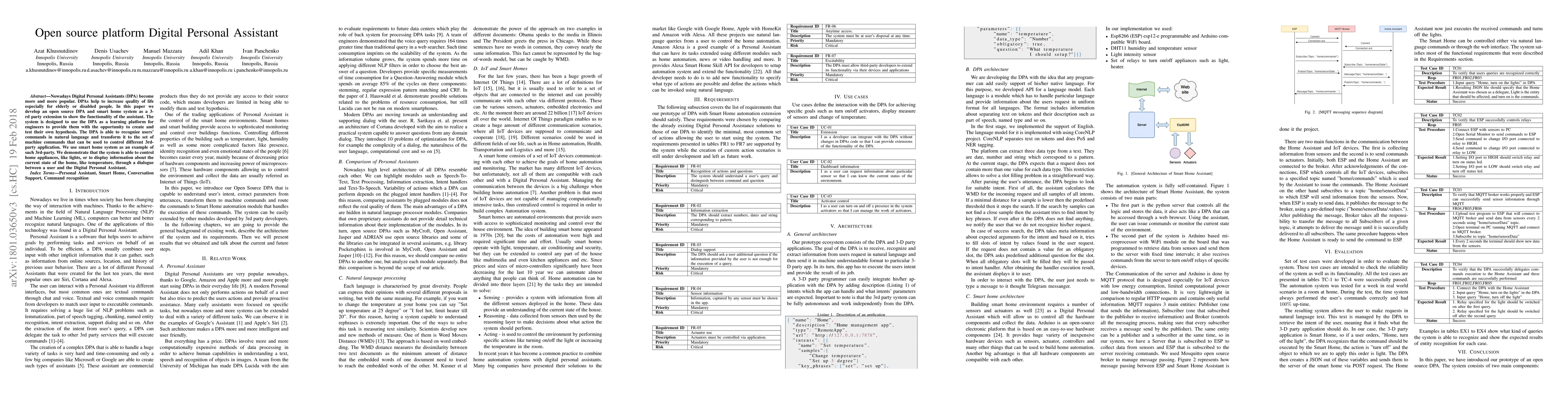 Nowadays Digital Personal Assistants (DPA) become more and more popular. DPAs help to increase quality of life especially for elderly or disabled people. In this paper we develop an open source DPA and smart home system as a 3-rd party extension to show the functionality of the assistant. The system is designed to use the DPA as a learning platform for engineers to provide them with the opportunity to create and test their own hypothesis. The DPA is able to recognize users' commands in natural language and transform it to the set of machine commands that can be used to control different 3rd-party application. We use smart home system as an example of such 3rd-party. We demonstrate that the system is able to control home appliances, like lights, or to display information about the current state of the home, like temperature, through a dialogue between a user and the Digital Personal Assistant.