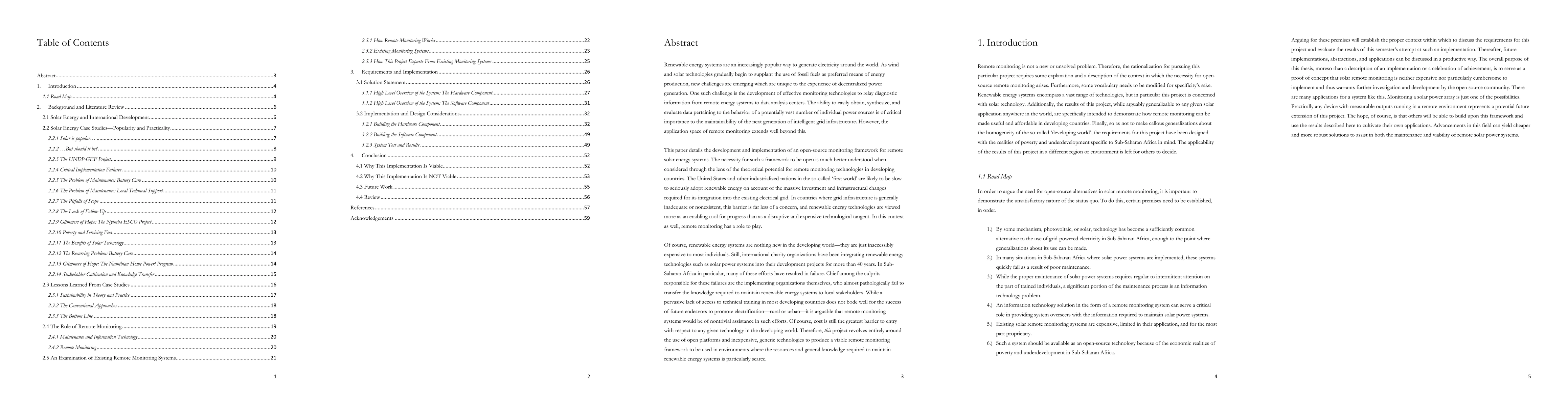 This paper develops an open-source remote monitoring framework for rural solar electrification projects, emphasizing its importance for maintainability in decentralized power generation and its potential to enable renewable energy adoption in developing countries where traditional grid infrastructure is lacking.
