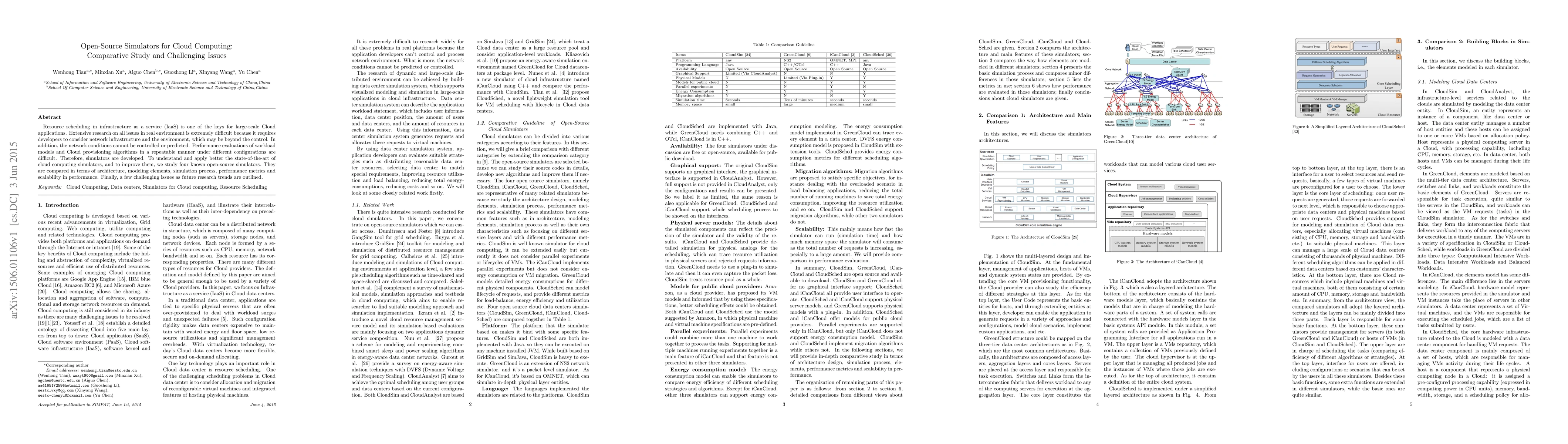 This paper compares four open-source simulators for cloud computing, evaluating their architecture, modeling elements, simulation processes, performance metrics, and scalability. It identifies key challenging issues for future research to improve these simulators.