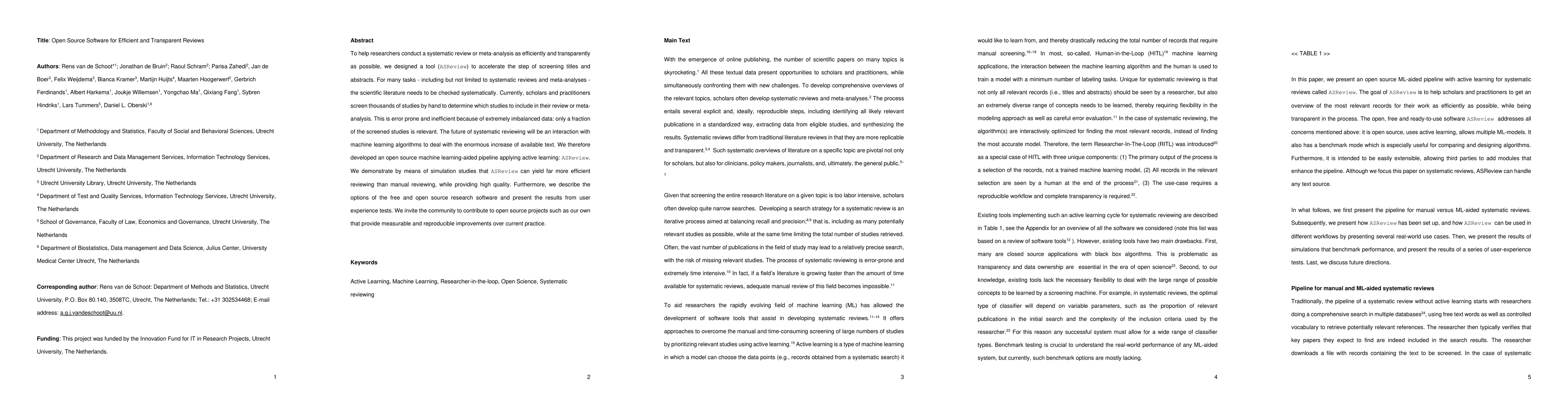 The paper introduces ASReview, an open source tool that uses machine learning and active learning to efficiently and transparently screen titles and abstracts for systematic reviews and meta-analyses, significantly reducing manual effort and improving accuracy. The authors demonstrate its effectiveness through simulation studies and invite the research community to contribute to open source advancements in this field.