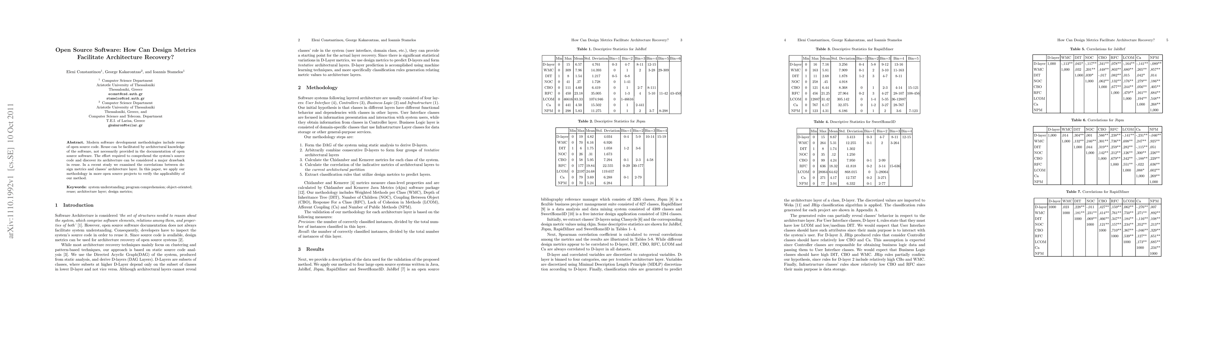 This paper explores how design metrics can aid in understanding and recovering architecture in open source software, addressing the challenge of comprehending system architecture from source code. The authors verify their methodology through additional open source projects, aiming to facilitate better reuse of open source code.