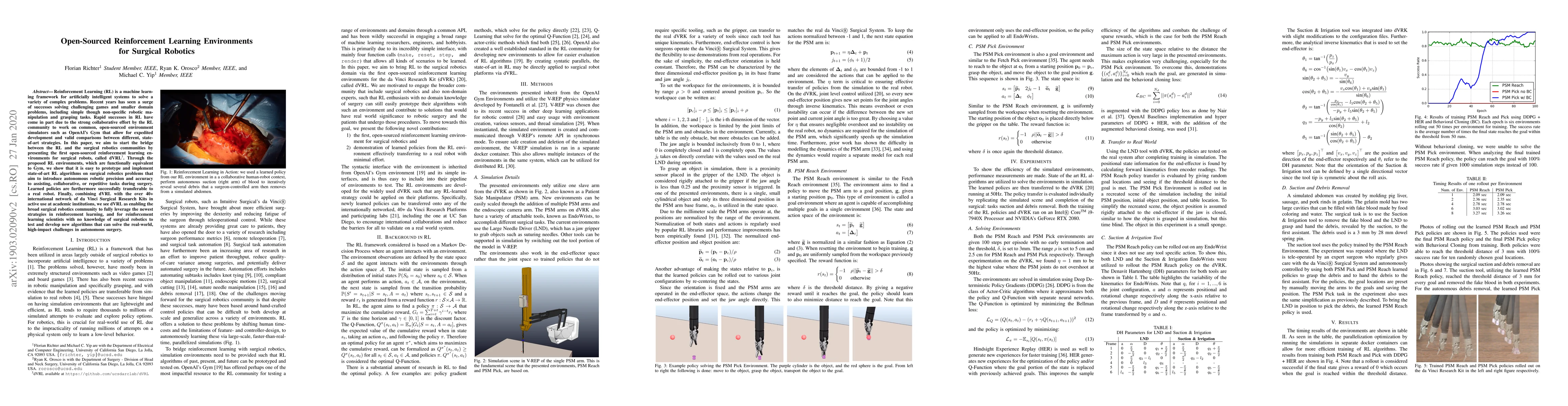 The research presents dVRL, an open-sourced reinforcement learning environment for surgical robotics, built on top of OpenAI Gym, using V-REP physics simulator. It focuses on the da Vinci Research Kit (dVRK) and utilizes state-of-the-art RL algorithms like DDPG and HER.