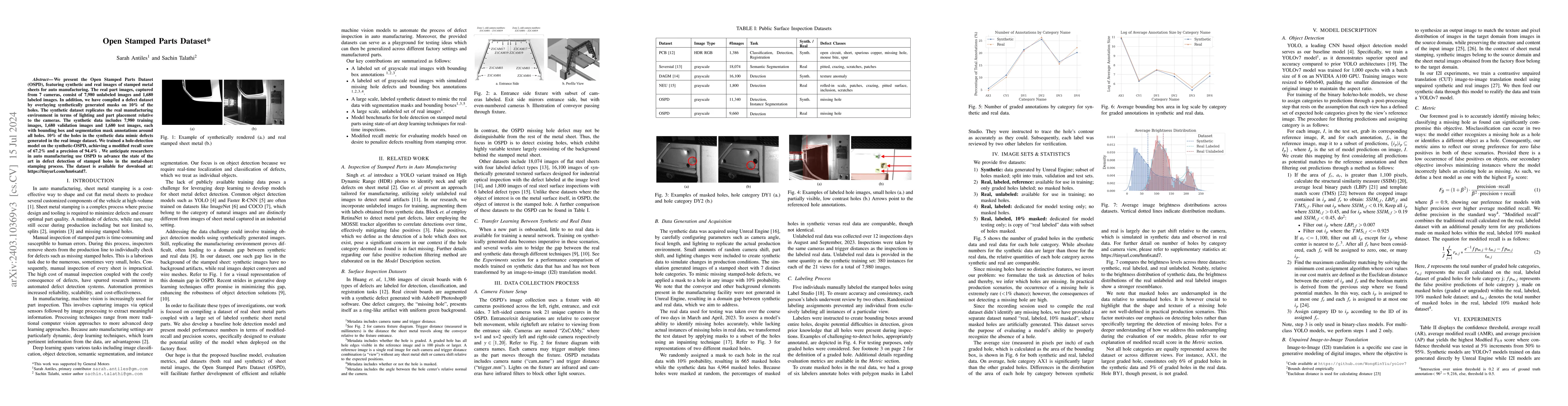 The Open Stamped Parts Dataset (OSPD) includes both synthetic and real images of stamped metal sheets for auto manufacturing, with real images captured from 7 cameras comprising 7,980 unlabeled and 1,680 labeled images, along with a defect dataset. The trained hole-detection model achieved a recall of 67.2% and precision of 94.4%, aiming to advance defect detection research.