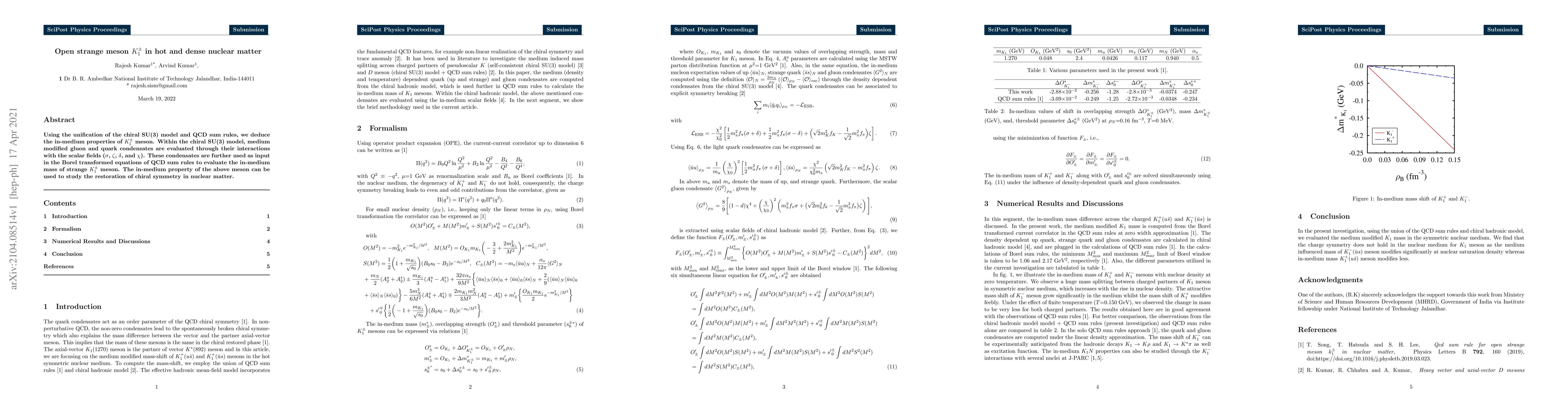 This paper uses a combination of the chiral SU(3) model and QCD sum rules to determine the in-medium properties of the strange meson $K^\pm_1$ in hot and dense nuclear matter, evaluating its mass through modified gluon and quark condensates. The study aims to understand the restoration of chiral symmetry in such environments.