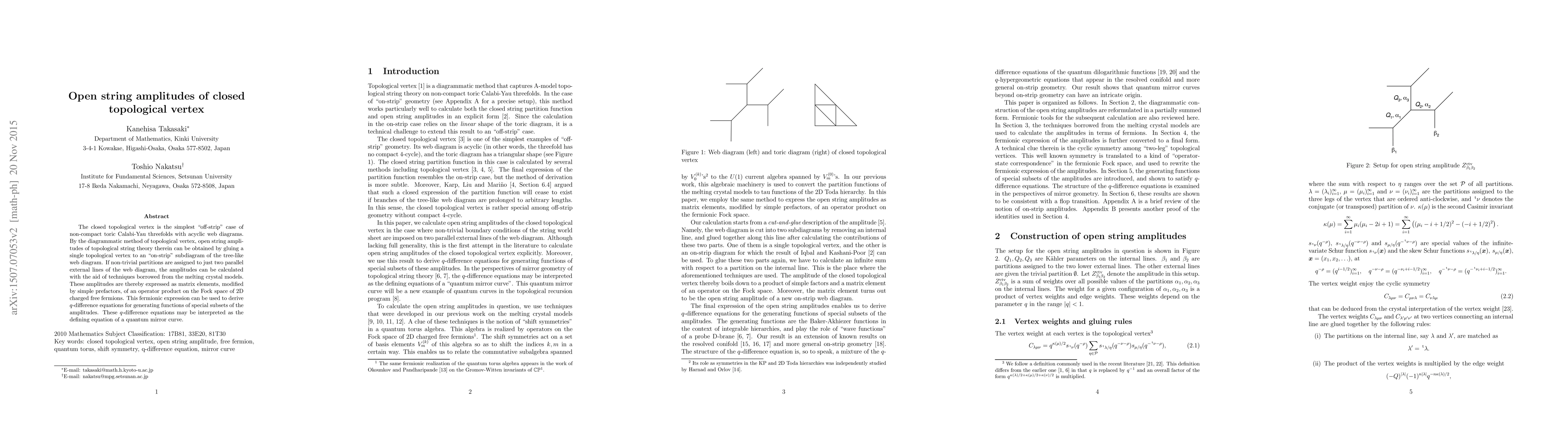 This paper explores the calculation of open string amplitudes in topological string theory using the closed topological vertex approach. It employs the diagrammatic method to glue a topological vertex to an on-strip subdiagram, deriving the amplitudes as matrix elements of an operator product on the Fock space of 2D charged free fermions, and establishing $q$-difference equations that define a quantum mirror curve.