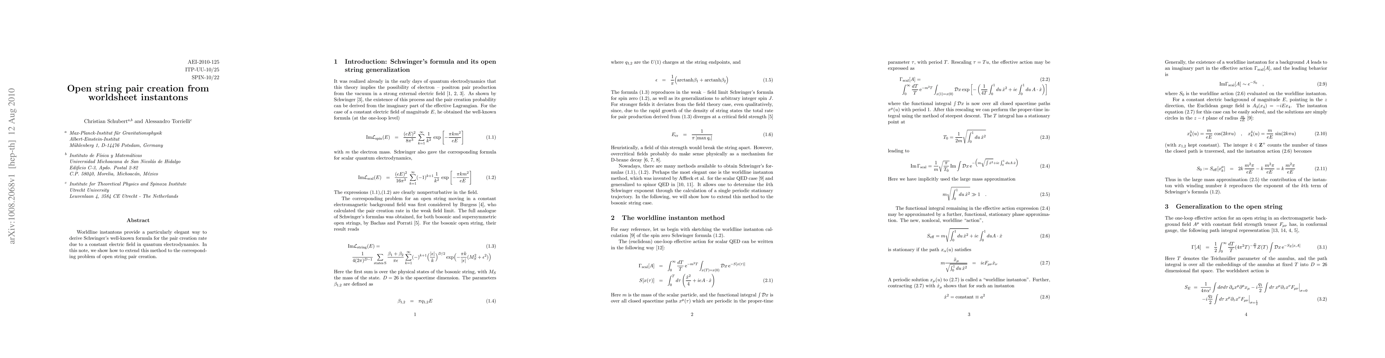 Summary: This paper demonstrates how worldline instantons can elegantly derive Schwinger's formula for pair creation in quantum electrodynamics, and extends this method to open string pair creation in string theory.