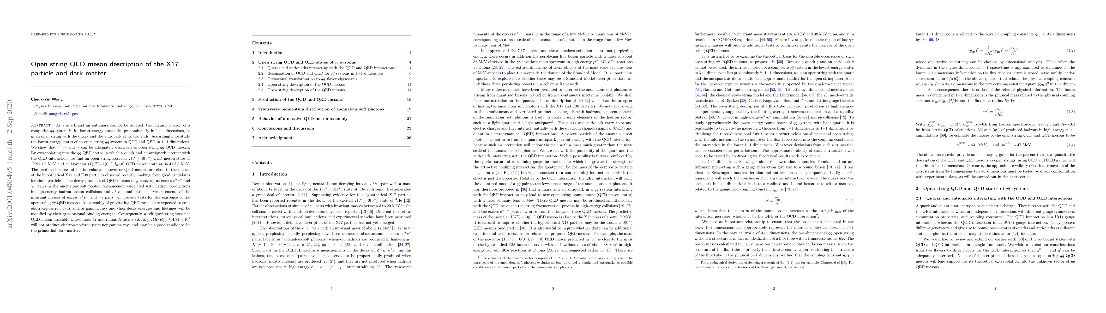 As a quark and an antiquark cannot be isolated, the intrinsic motion of a composite $q \bar q$ system in its lowest-energy states lies predominantly in 1+1 dimensions, as in an open string with the quark and the antiquark at its two ends. Accordingly, we study the lowest-energy states of an open string $q\bar q$ system in QCD and QED in 1+1 dimensions. We show that $\pi^0, \eta$, and $\eta'$ can be adequately described as open string $q\bar q$ QCD mesons. By extrapolating into the $q\bar q$ QED sector in which a quark and an antiquark interact with the QED interaction, we find an open string isoscalar $I(J^\pi)$=$0(0^-)$ QED meson state at 17.9$\pm$1.5 MeV and an isovector $(I(J^\pi)$=$1(0^-), I_3$=0) QED meson state at 36.4$\pm$3.8 MeV. The predicted masses of the isoscalar and isovector QED mesons are close to the masses of the hypothetical X17 and E38 particles observed recently, making them good candidates for these particles. The decay products of QED mesons may show up as excess $e^+e^-$ and $\gamma \gamma$ pairs in the anomalous soft photon phenomenon associated with hadron productions in high-energy hadron-proton collisions and $e^+$-$e^-$ annihilations. Measurements of the invariant masses of excess $e^+e^-$ and $\gamma \gamma$ pairs will provide tests for the existence of the open string $q\bar q$ QED mesons. An assembly of gravitating QED mesons are expected to emit electron-positron pairs and/or gamma rays and their decay energies and lifetimes will be modified by their gravitational binding energies. Consequently, a self-gravitating isoscalar QED meson assembly whose mass $M$ and radius $R$ satisfy $(M/M_\odot)/(R/R_\odot) \gtrsim 4.71 \times 10^5$ will not produce electron-positron pairs nor gamma rays and may be a good candidate for the primordial dark matter.