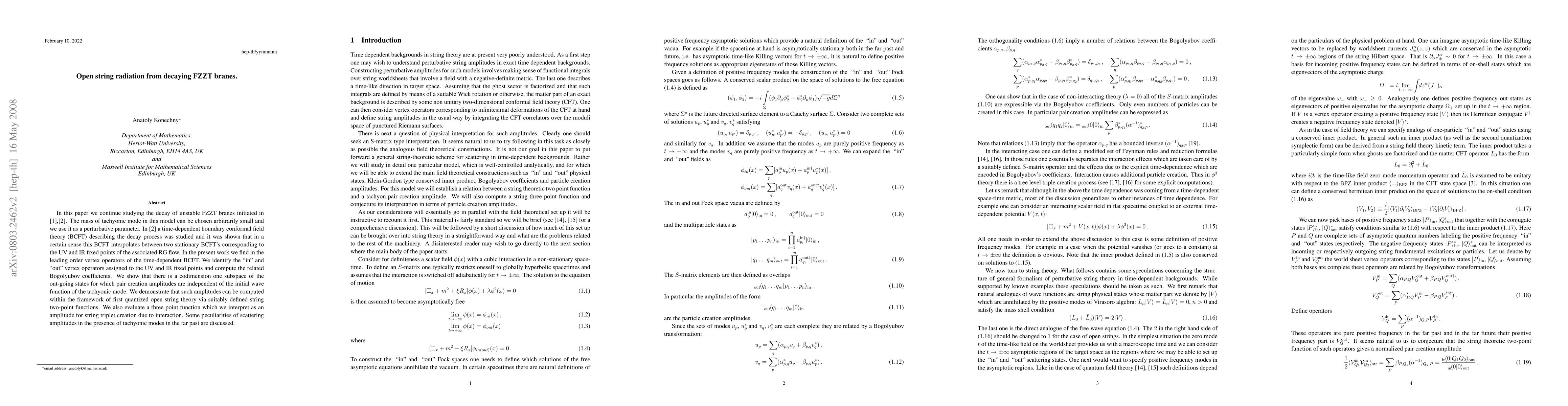 In this paper we continue studying the decay of unstable FZZT branes initiated in [1],[2]. The mass of tachyonic mode in this model can be chosen arbitrarily small and we use it as a perturbative parameter. In [2] a time-dependent boundary conformal field theory (BCFT) describing the decay process was studied and it was shown that in a certain sense this BCFT interpolates between two stationary BCFT's corresponding to the UV and IR fixed points of the associated RG flow. In the present work we find in the leading order vertex operators of the time-dependent BCFT. We identify the "in" and "out" vertex operators assigned to the UV and IR fixed points and compute the related Bogolyubov coefficients. We show that there is a codimension one subspace of the out-going states for which pair creation amplitudes are independent of the initial wave function of the tachyonic mode. We demonstrate that such amplitudes can be computed within the framework of first quantized open string theory via suitably defined string two-point functions. We also evaluate a three point function which we interpret as an amplitude for string triplet creation due to interaction. Some peculiarities of scattering amplitudes in the presence of tachyonic modes in the far past are discussed.