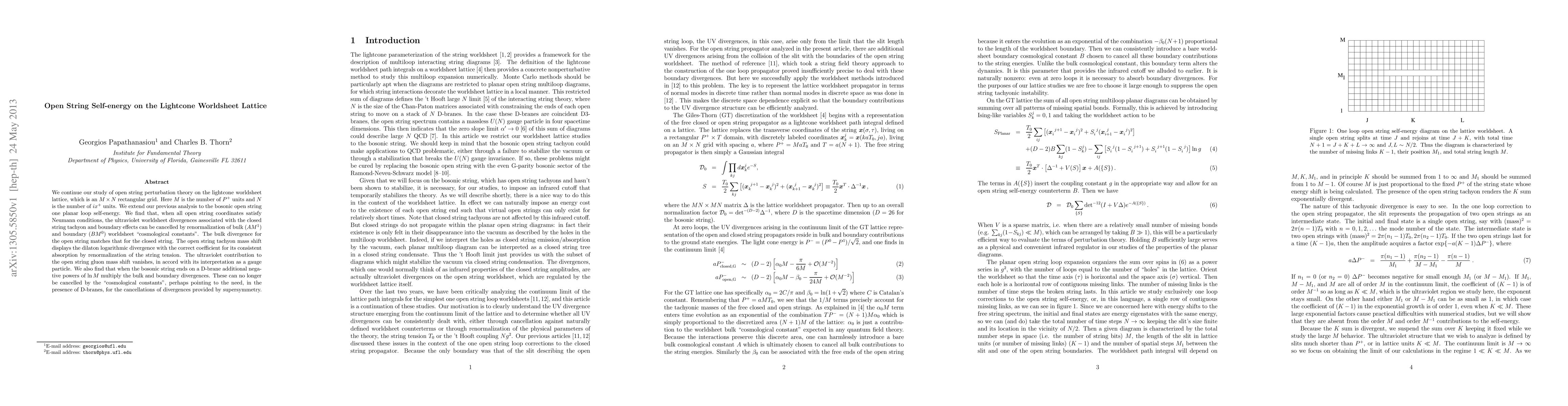We continue our study of open string perturbation theory on the lightcone worldsheet lattice, which is an $M\times N$ rectangular grid. Here $M$ is the number of $P^+$ units and $N$ is the number of $ix^+$ units. We extend our previous analysis to the bosonic open string one planar loop self-energy. We find that, when all open string coordinates satisfy Neumann conditions, the ultraviolet worldsheet divergences associated with the closed string tachyon and boundary effects can be cancelled by renormalization of bulk ($AM^1$) and boundary ($BM^0$) worldsheet "cosmological constants". The bulk divergence for the open string matches that for the closed string. The open string tachyon mass shift displays the dilaton logarithmic divergence with the correct coefficient for its consistent absorption by renormalization of the string tension. The ultraviolet contribution to the open string gluon mass shift vanishes, in accord with its interpretation as a gauge particle. We also find that when the bosonic string ends on a D-brane additional negative powers of $\ln M$ multiply the bulk and boundary divergences. These can no longer be cancelled by the "cosmological constants", perhaps pointing to the need, in the presence of D-branes, for the cancellations of divergences provided by supersymmetry.