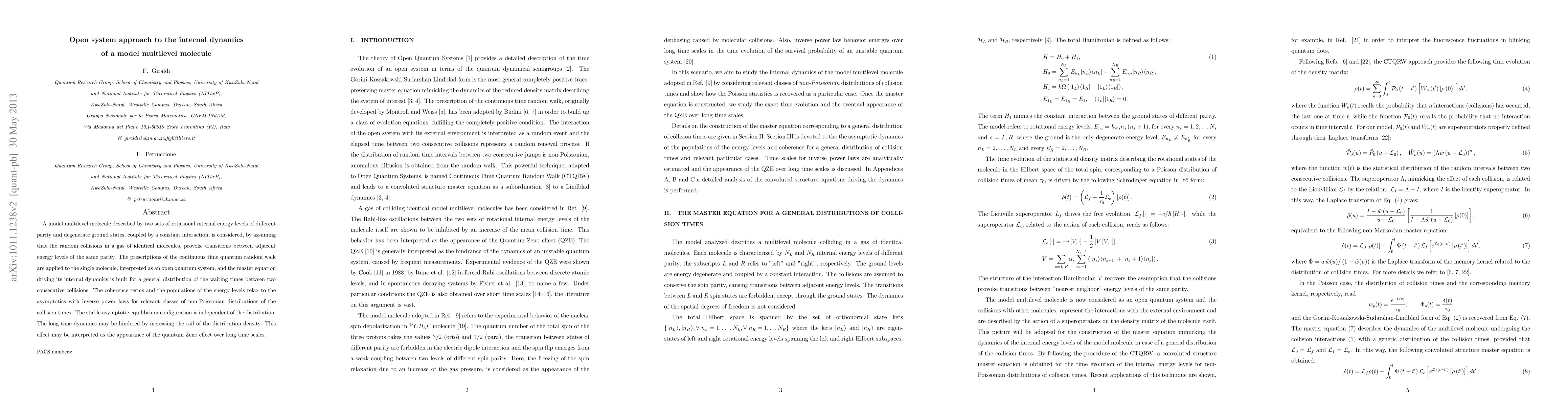 A model multilevel molecule described by two sets of rotational internal energy levels of different parity and degenerate ground states, coupled by a constant interaction, is considered, by assuming that the random collisions in a gas of identical molecules, provoke transitions between adjacent energy levels of the same parity. The prescriptions of the continuous time quantum random walk are applied to the single molecule, interpreted as an open quantum system, and the master equation driving its internal dynamics is built for a general distribution of the waiting times between two consecutive collisions. The coherence terms and the populations of the energy levels relax to the asymptotics with inverse power laws for relevant classes of non-Poissonian distributions of the collision times. The stable asymptotic equilibrium configuration is independent of the distribution. The long time dynamics may be hindered by increasing the tail of the distribution density. This effect may be interpreted as the appearance of the quantum Zeno effect over long time scales.