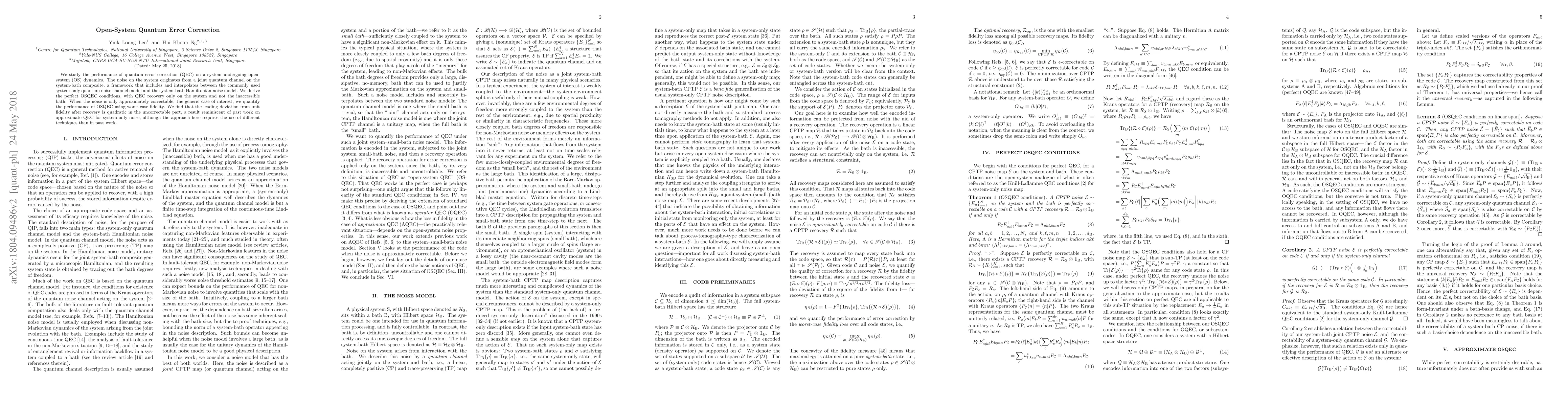 We study the performance of quantum error correction (QEC) on a system undergoing open-system (OS) dynamics. The noise on the system originates from a joint quantum channel on the system-bath composite, a framework that includes and interpolates between the commonly used system-only quantum noise channel model and the system-bath Hamiltonian noise model. We derive the perfect OSQEC conditions, with QEC recovery only on the system and not the inaccessible bath. When the noise is only approximately correctable, the generic case of interest, we quantify the performance of OSQEC using worst-case fidelity. We find that the leading deviation from unit fidelity after recovery is quadratic in the uncorrectable part, a result reminiscent of past work on approximate QEC for system-only noise, although the approach here requires the use of different techniques than in past work.