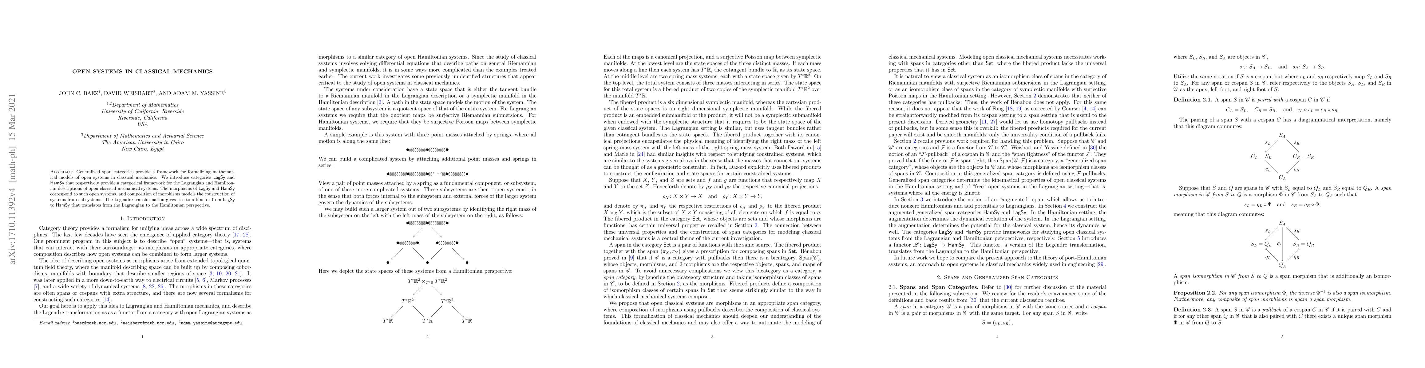 Generalized span categories provide a framework for formalizing mathematical models of open systems in classical mechanics. We introduce categories $\mathsf{LagSy}$ and $\mathsf{HamSy}$ that respectively provide a categorical framework for the Lagrangian and Hamiltonian descriptions of open classical mechanical systems. The morphisms of $\mathsf{LagSy}$ and $\mathsf{HamSy}$ correspond to such open systems, and composition of morphisms models the construction of systems from subsystems. The Legendre transformation gives rise to a functor from $\mathsf{LagSy}$ to $\mathsf{HamSy}$ that translates from the Lagrangian to the Hamiltonian perspective.