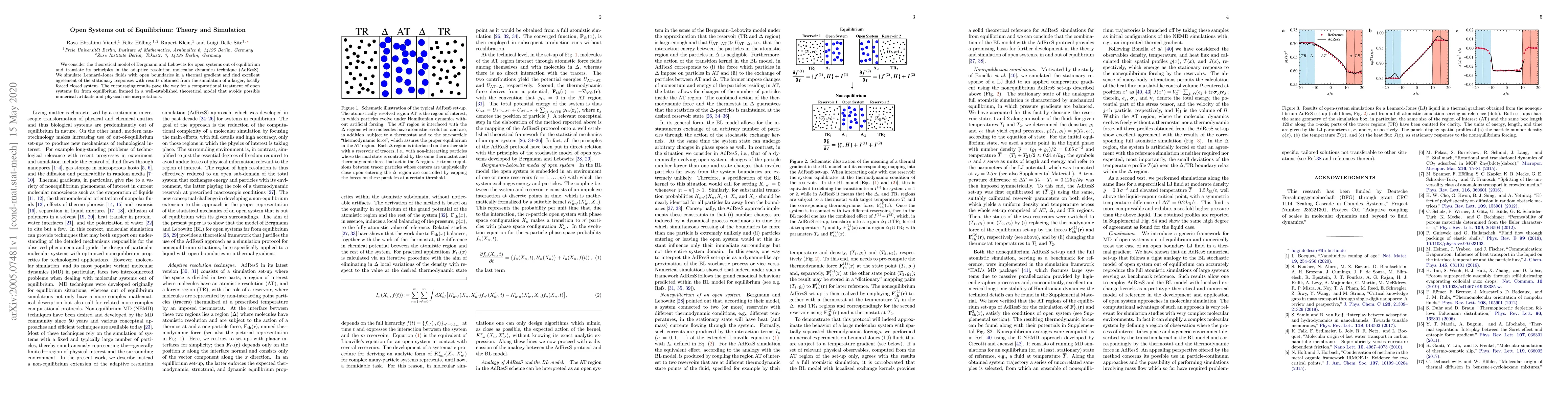 This paper applies Bergmann and Lebowitz's theoretical model to open systems out of equilibrium using the adaptive resolution molecular dynamics technique (AdResS). Simulations of Lennard-Jones fluids in thermal gradients show good agreement with closed system simulations, supporting the model's validity for studying non-equilibrium systems.