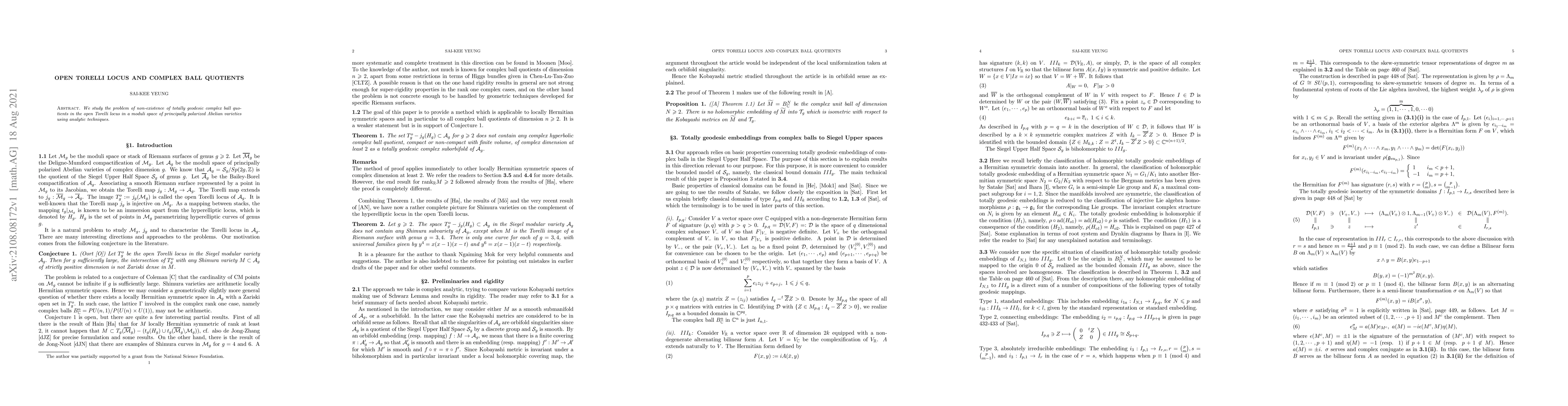 Summary: This paper investigates the non-existence of totally geodesic complex ball quotients within the open Torelli locus of moduli spaces for principally polarized Abelian varieties, employing analytic techniques to reach its conclusions.