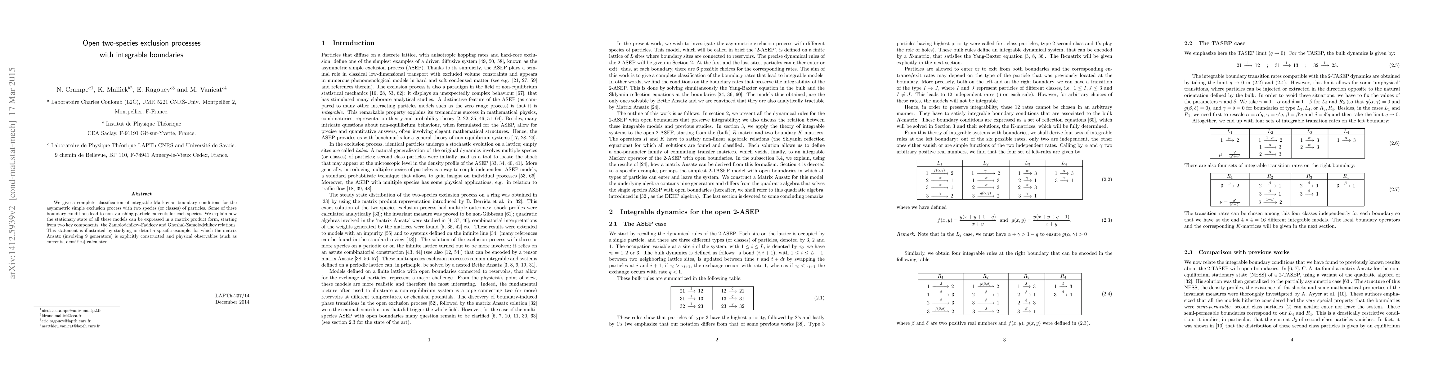This paper classifies integrable boundary conditions for a two-species asymmetric simple exclusion process, showing that stationary states can be represented in a matrix product form using the Zamolodchikov-Faddeev and Ghoshal-Zamolodchikov relations, and exemplifies this with a detailed analysis involving 9 generators and calculation of physical observables like currents and densities.