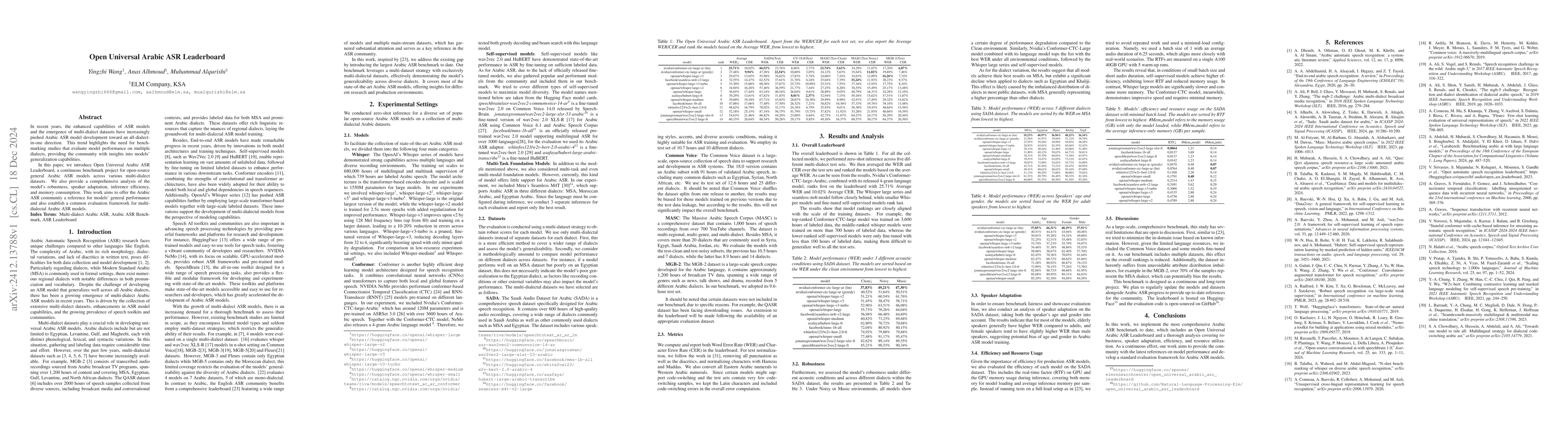 In recent years, the enhanced capabilities of ASR models and the emergence of multi-dialect datasets have increasingly pushed Arabic ASR model development toward an all-dialect-in-one direction. This trend highlights the need for benchmarking studies that evaluate model performance on multiple dialects, providing the community with insights into models' generalization capabilities. In this paper, we introduce Open Universal Arabic ASR Leaderboard, a continuous benchmark project for open-source general Arabic ASR models across various multi-dialect datasets. We also provide a comprehensive analysis of the model's robustness, speaker adaptation, inference efficiency, and memory consumption. This work aims to offer the Arabic ASR community a reference for models' general performance and also establish a common evaluation framework for multi-dialectal Arabic ASR models.