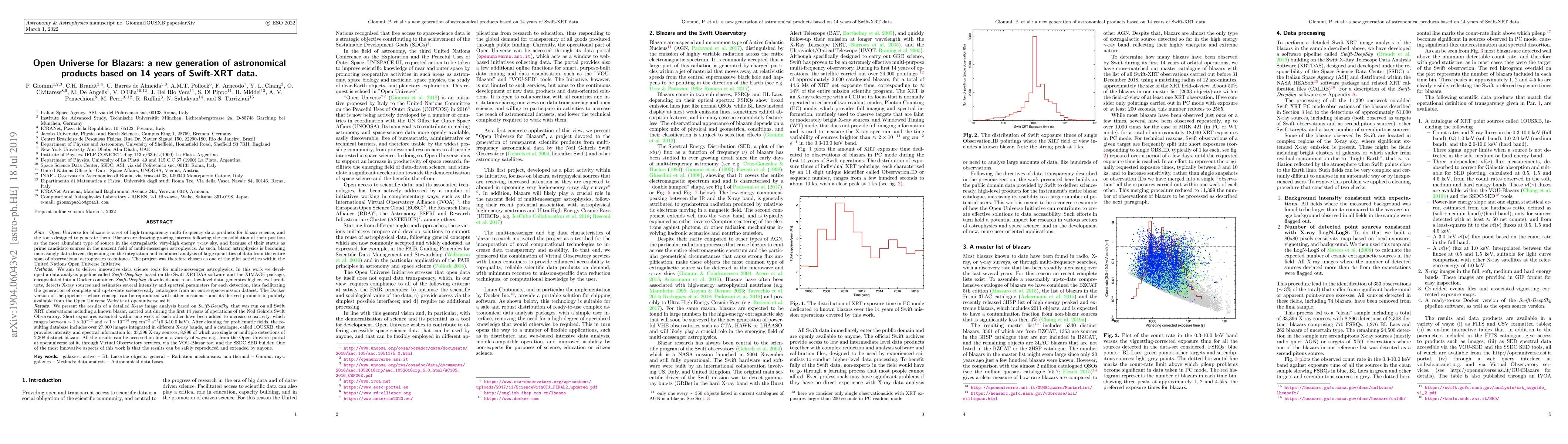 Open Universe for blazars is a set of high-transparency data products for blazar science, and the tools designed to generate them. Blazar astrophysics is becoming increasingly data driven, depending on the integration and combined analysis of large quantities of data from the entire span of observational astrophysics techniques. The project was therefore chosen as one of the pilot activities within the United Nations Open Universe Initiative. In this work we developed a data analysis pipeline called Swift_deepsky, based on the Swift XRTDAS software and the XIMAGE package, encapsulated into a Docker container. Swift_deepsky, downloads and reads low-level data, generates higher-level products, detects X-ray sources and estimates several intensity and spectral parameters for each detection, thus facilitating the generation of complete and up-to-date science-ready catalogues from an entire space-mission dataset. The Docker version of the pipeline and its derived products is publicly available from the Open Universe Website at openuniverse.asi.it. We present the results of a detailed X-ray image analysis based on Swift_deepsky on all Swift XRT observations including a known blazar, carried out during the first 14 years of operations of the Swift Observatory. The resulting database includes over 27,000 images integrated in different X-ray bands, and a catalogue, called 1OUSXB, that provides intensity and spectral information for 33,396 X-ray sources, 8,896 of which are single or multiple detections of 2,308 distinct blazars. All the results can be accessed on-line in a variety of ways: e.g., from the Open Universe portal at openuniverse.asi.it, through Virtual Observatory services, via the VOU-Blazar tool and the SSDC SED builder. One of the most innovative aspects of this work is that the results can be safely reproduced and extended by anyone.