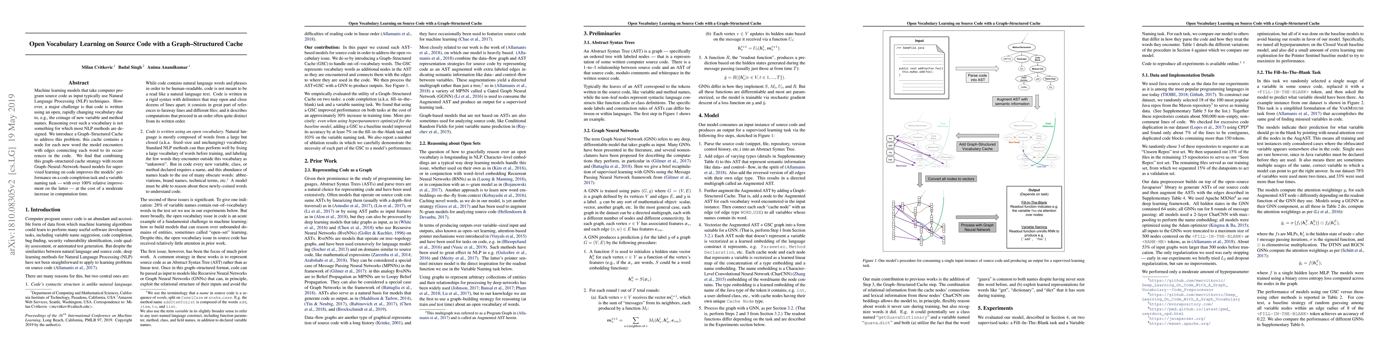 Machine learning models that take computer program source code as input typically use Natural Language Processing (NLP) techniques. However, a major challenge is that code is written using an open, rapidly changing vocabulary due to, e.g., the coinage of new variable and method names. Reasoning over such a vocabulary is not something for which most NLP methods are designed. We introduce a Graph-Structured Cache to address this problem; this cache contains a node for each new word the model encounters with edges connecting each word to its occurrences in the code. We find that combining this graph-structured cache strategy with recent Graph-Neural-Network-based models for supervised learning on code improves the models' performance on a code completion task and a variable naming task --- with over $100\%$ relative improvement on the latter --- at the cost of a moderate increase in computation time.