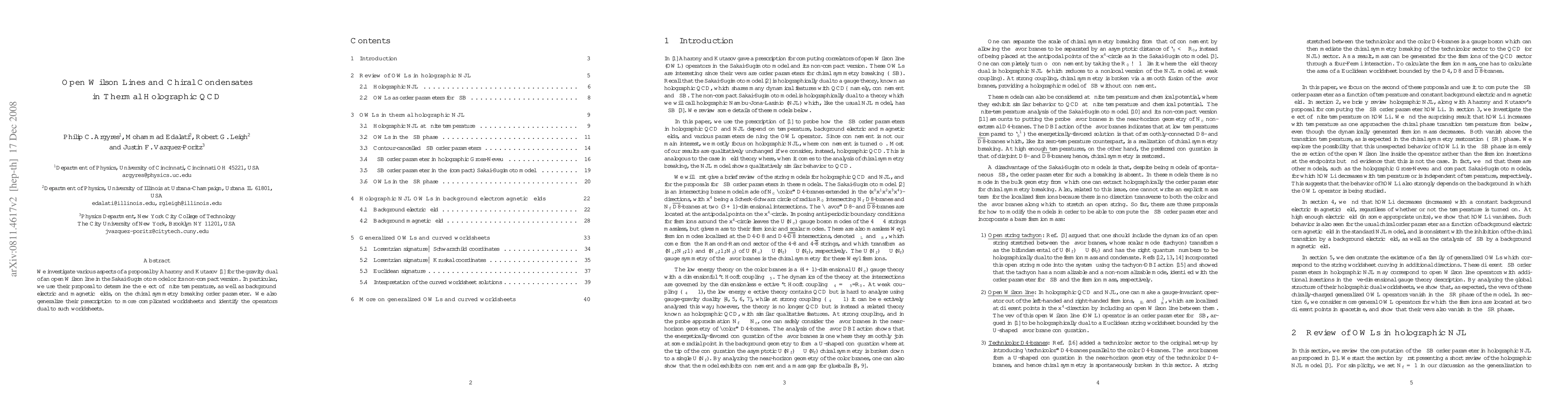 We investigate various aspects of a proposal by Aharony and Kutasov arXiv:0803.3547 [hep-th] for the gravity dual of an open Wilson line in the Sakai-Sugimoto model or its non-compact version. In particular, we use their proposal to determine the effect of finite temperature, as well as background electric and magnetic fields, on the chiral symmetry breaking order parameter. We also generalize their prescription to more complicated worldsheets and identify the operators dual to such worldsheets.