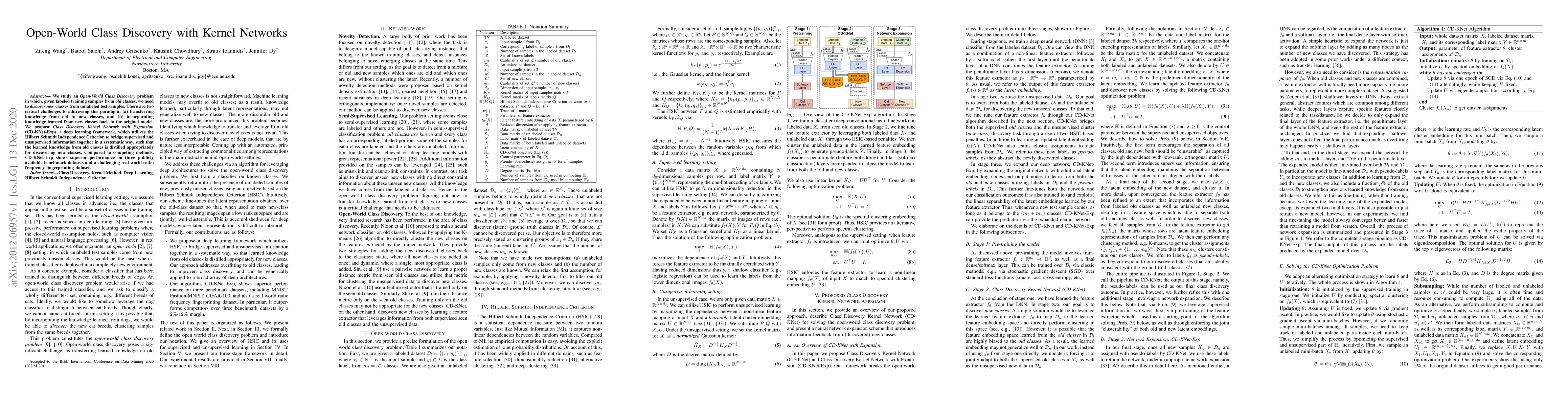 We study an Open-World Class Discovery problem in which, given labeled training samples from old classes, we need to discover new classes from unlabeled test samples. There are two critical challenges to addressing this paradigm: (a) transferring knowledge from old to new classes, and (b) incorporating knowledge learned from new classes back to the original model. We propose Class Discovery Kernel Network with Expansion (CD-KNet-Exp), a deep learning framework, which utilizes the Hilbert Schmidt Independence Criterion to bridge supervised and unsupervised information together in a systematic way, such that the learned knowledge from old classes is distilled appropriately for discovering new classes. Compared to competing methods, CD-KNet-Exp shows superior performance on three publicly available benchmark datasets and a challenging real-world radio frequency fingerprinting dataset.