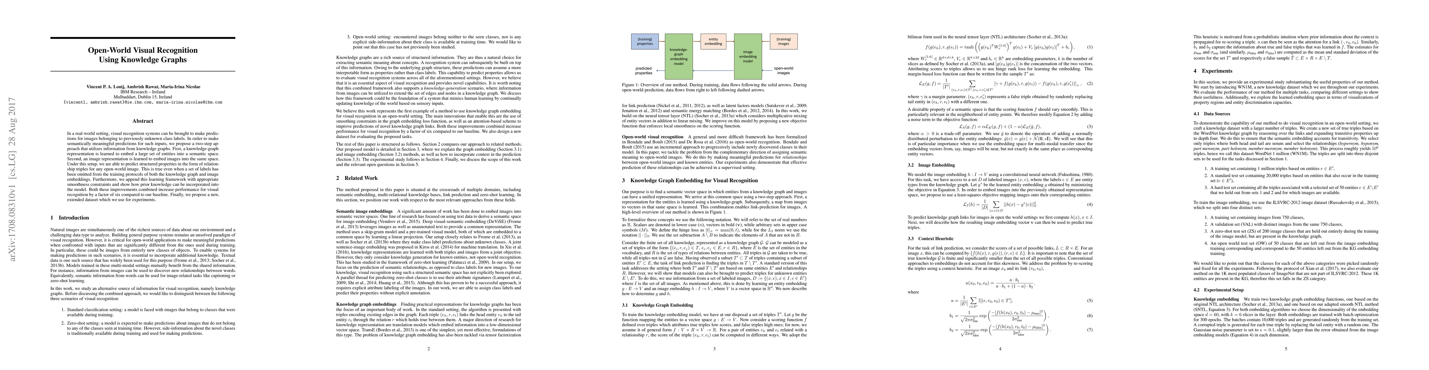 In a real-world setting, visual recognition systems can be brought to make predictions for images belonging to previously unknown class labels. In order to make semantically meaningful predictions for such inputs, we propose a two-step approach that utilizes information from knowledge graphs. First, a knowledge-graph representation is learned to embed a large set of entities into a semantic space. Second, an image representation is learned to embed images into the same space. Under this setup, we are able to predict structured properties in the form of relationship triples for any open-world image. This is true even when a set of labels has been omitted from the training protocols of both the knowledge graph and image embeddings. Furthermore, we append this learning framework with appropriate smoothness constraints and show how prior knowledge can be incorporated into the model. Both these improvements combined increase performance for visual recognition by a factor of six compared to our baseline. Finally, we propose a new, extended dataset which we use for experiments.