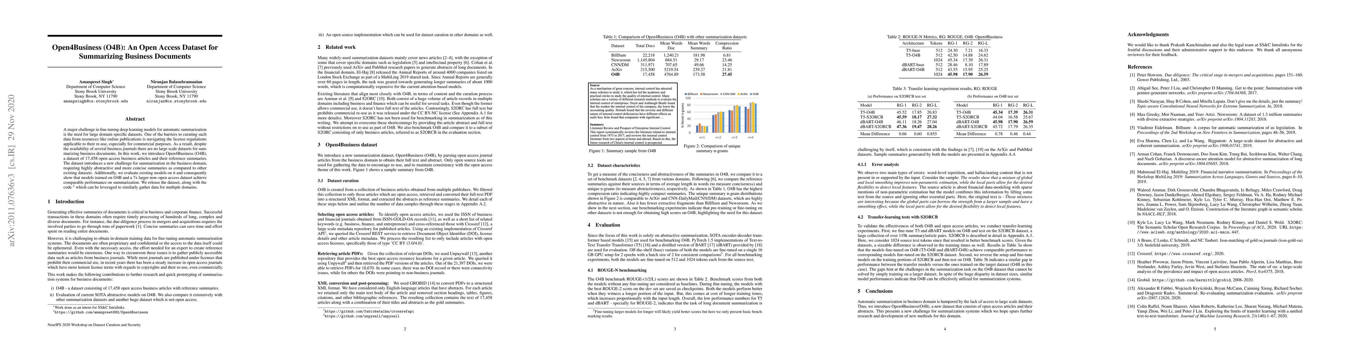 Open4Business (O4B) is an open access dataset comprising 17,458 business articles and their reference summaries, designed to address the lack of large datasets for business document summarization. The dataset enables the evaluation of summarization models, showing comparable performance when trained on O4B and a larger non-open access dataset.