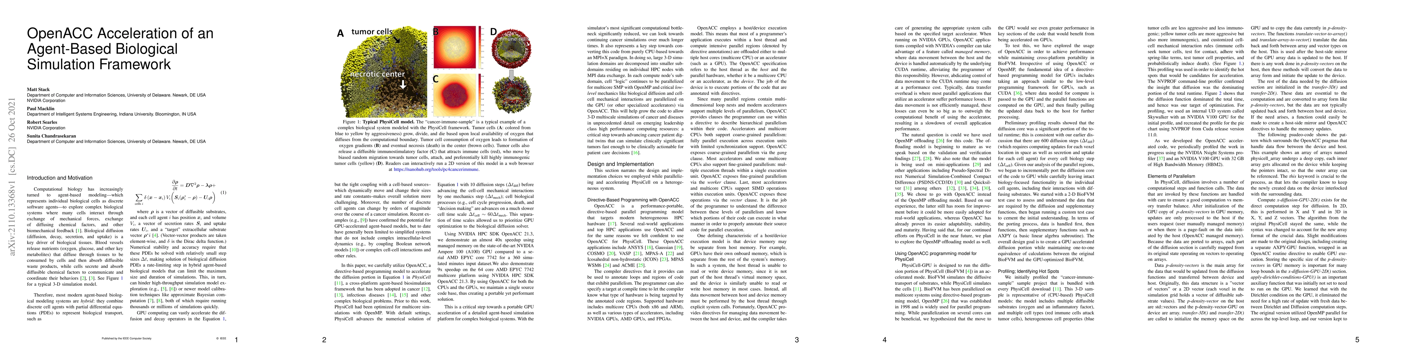 This paper explores the use of OpenACC to accelerate the diffusion component of PhysiCell, an agent-based biological simulation framework, achieving nearly 40x speedup on an A100 GPU and 9x on a multicore AMD EPYC 7742, while maintaining a single-source code base for portability.