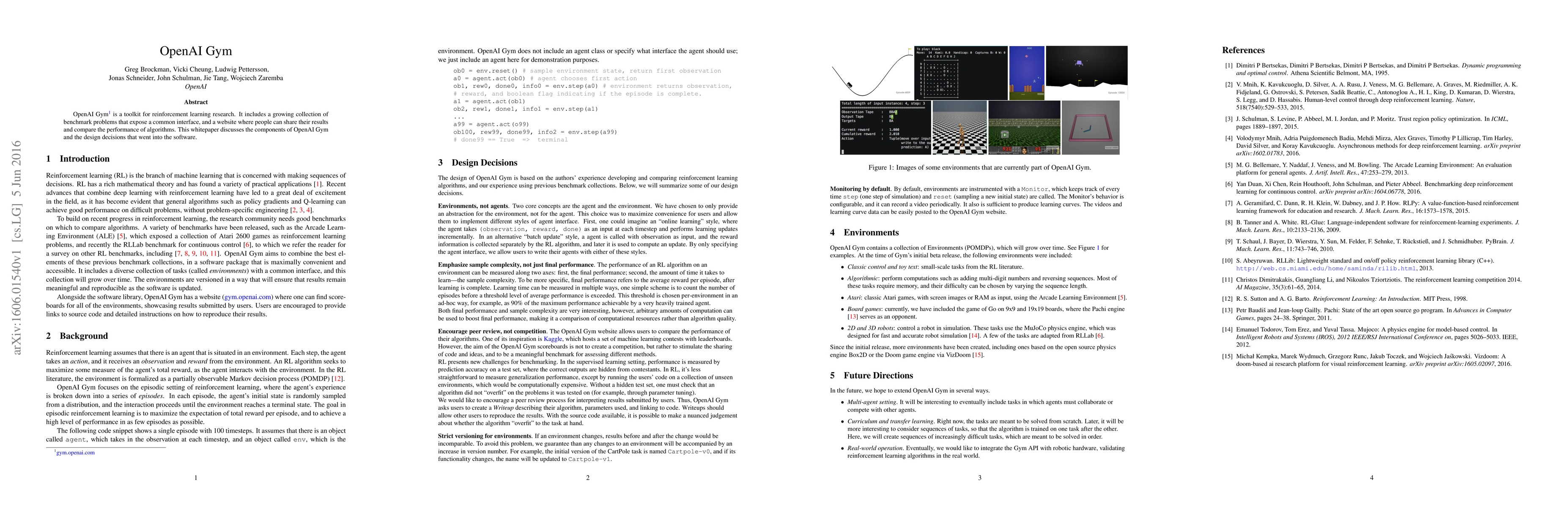 Summary: OpenAI Gym is a versatile toolkit for reinforcement learning research featuring a common interface for various benchmark problems. It facilitates algorithm performance comparisons and showcases design choices behind its development.