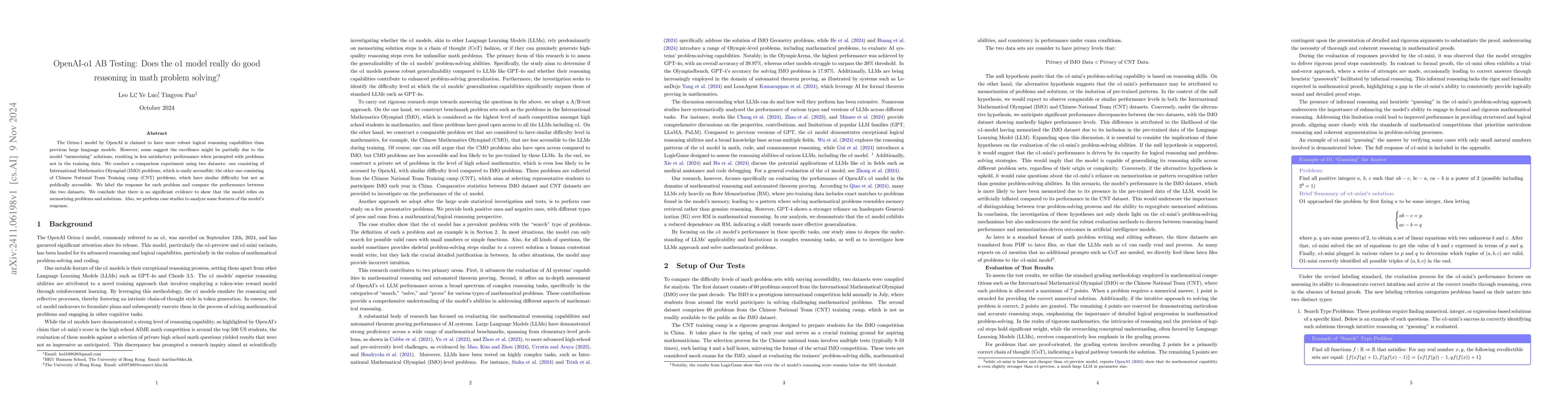 The Orion-1 model by OpenAI is claimed to have more robust logical reasoning capabilities than previous large language models. However, some suggest the excellence might be partially due to the model "memorizing" solutions, resulting in less satisfactory performance when prompted with problems not in the training data. We conduct a comparison experiment using two datasets: one consisting of International Mathematics Olympiad (IMO) problems, which is easily accessible; the other one consisting of Chinese National Team Training camp (CNT) problems, which have similar difficulty but not as publically accessible. We label the response for each problem and compare the performance between the two datasets. We conclude that there is no significant evidence to show that the model relies on memorizing problems and solutions. Also, we perform case studies to analyze some features of the model's response.