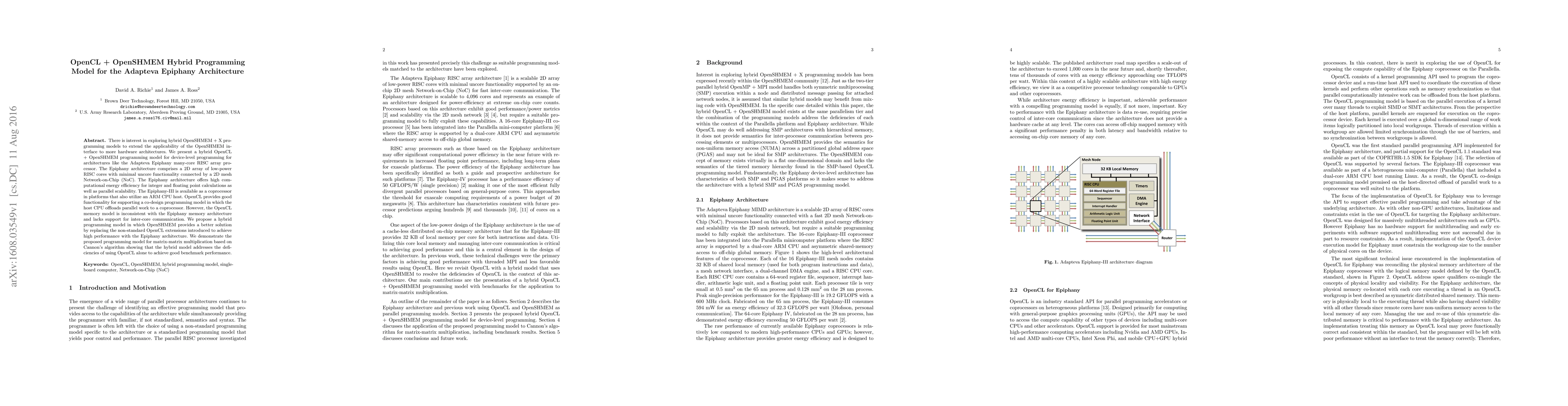 This paper proposes a hybrid OpenCL + OpenSHMEM programming model for the Adapteva Epiphany many-core architecture, addressing the limitations of OpenCL for inter-core communication and memory model inconsistencies. The hybrid model leverages OpenSHMEM to replace non-standard OpenCL extensions, demonstrating improved performance in matrix-matrix multiplication.