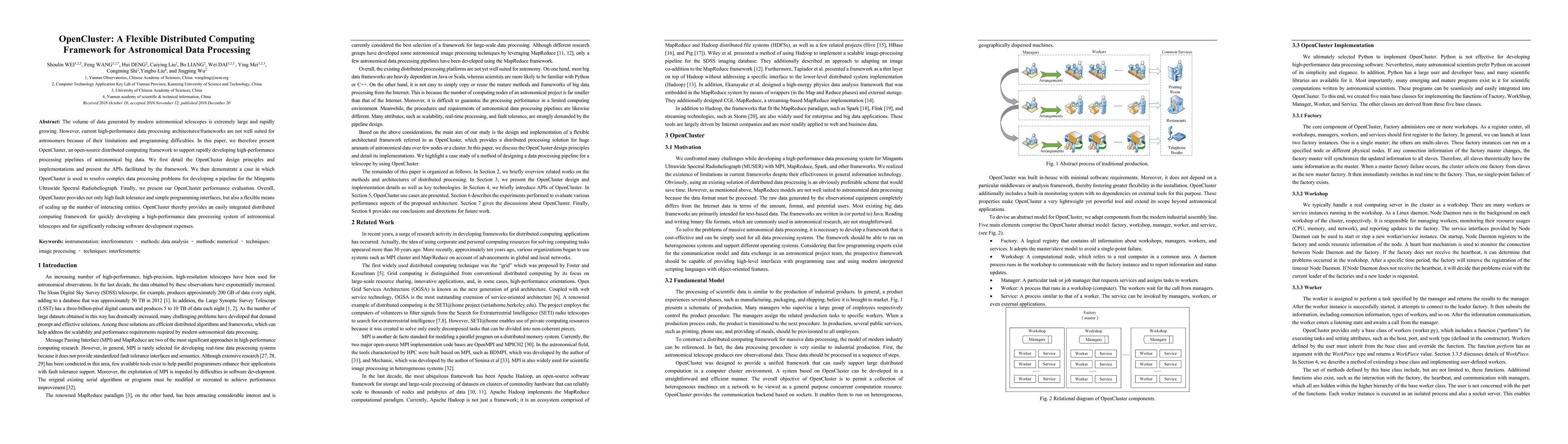 OpenCluster is an open-source distributed computing framework designed to address the challenges of processing large volumes of astronomical data efficiently. It offers high fault tolerance, simple programming interfaces, and flexibility in scaling, significantly reducing software development costs for astronomical data processing.