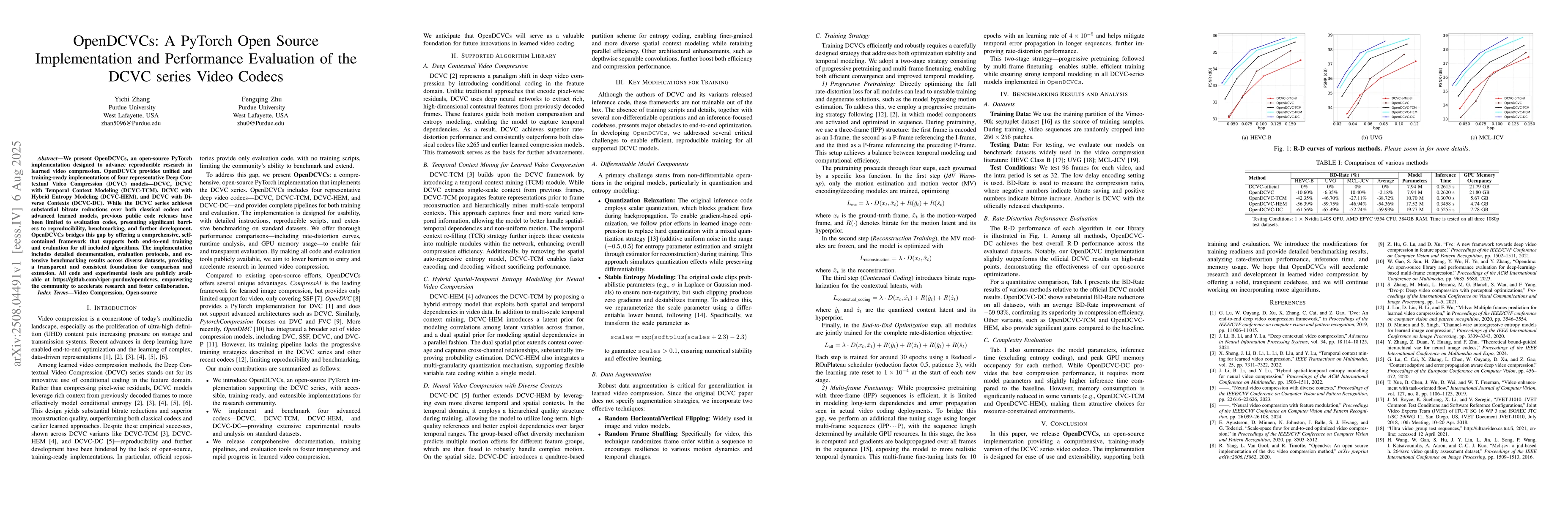 The paper presents OpenDCVCs, an open-source PyTorch implementation for the DCVC series video codecs, providing unified and training-ready implementations of DCVC, DCVC-TCM, DCVC-HEM, and DCVC-DC models. It includes detailed documentation, evaluation protocols, and extensive benchmarking results across diverse datasets.