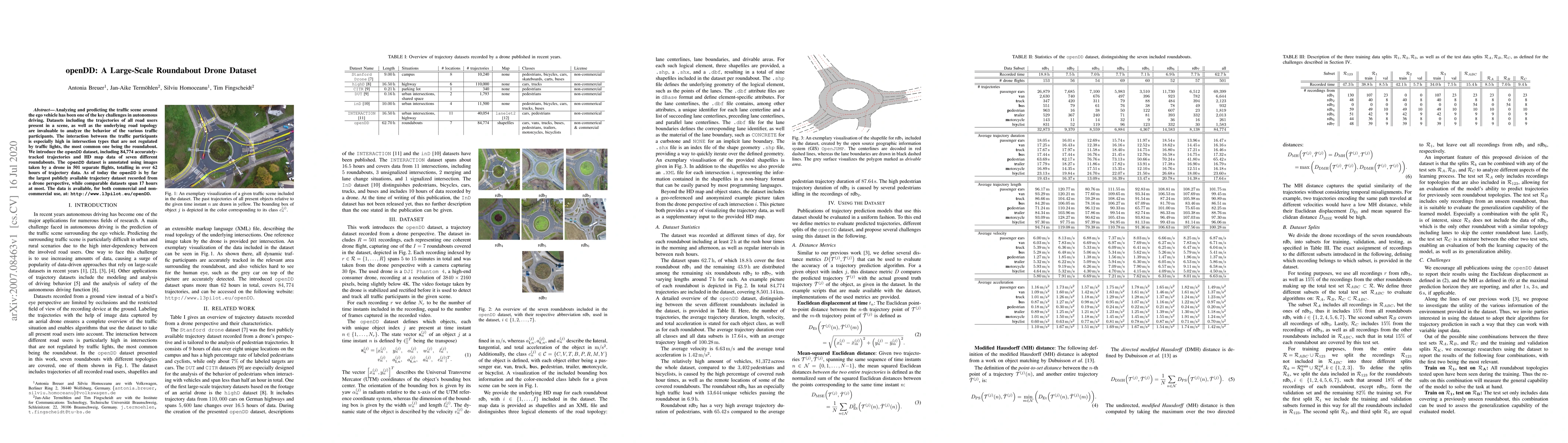 The openDD dataset presents a large-scale collection of roundabout drone trajectories, comprising 84,774 tracks and high-definition map data from seven roundabouts, aiming to enhance autonomous driving analysis. The dataset, recorded over 62 hours from drone flights, is the largest publicly available roundabout trajectory dataset.
