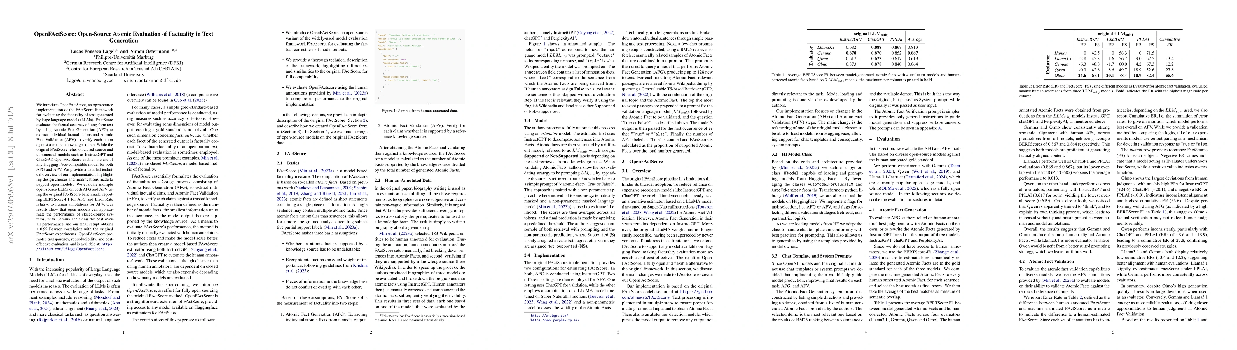 The paper introduces OpenFActScore, an open-source implementation of the FActScore framework for evaluating the factuality of text generated by large language models (LLMs). It uses Atomic Fact Generation (AFG) to extract individual factual claims and Atomic Fact Validation (AFV) to verify each claim against a trusted knowledge source, supporting any Hugging Face-compatible model for both AFG and AFV.