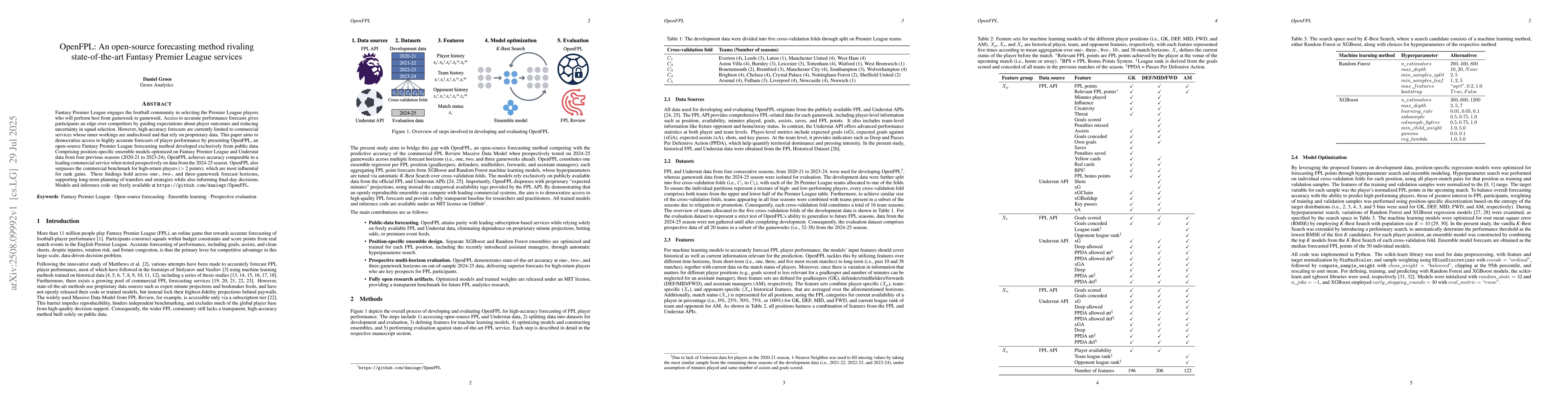 Fantasy Premier League engages the football community in selecting the Premier League players who will perform best from gameweek to gameweek. Access to accurate performance forecasts gives participants an edge over competitors by guiding expectations about player outcomes and reducing uncertainty in squad selection. However, high-accuracy forecasts are currently limited to commercial services whose inner workings are undisclosed and that rely on proprietary data. This paper aims to democratize access to highly accurate forecasts of player performance by presenting OpenFPL, an open-source Fantasy Premier League forecasting method developed exclusively from public data. Comprising position-specific ensemble models optimized on Fantasy Premier League and Understat data from four previous seasons (2020-21 to 2023-24), OpenFPL achieves accuracy comparable to a leading commercial service when tested prospectively on data from the 2024-25 season. OpenFPL also surpasses the commercial benchmark for high-return players ($>$ 2 points), which are most influential for rank gains. These findings hold across one-, two-, and three-gameweek forecast horizons, supporting long-term planning of transfers and strategies while also informing final-day decisions.