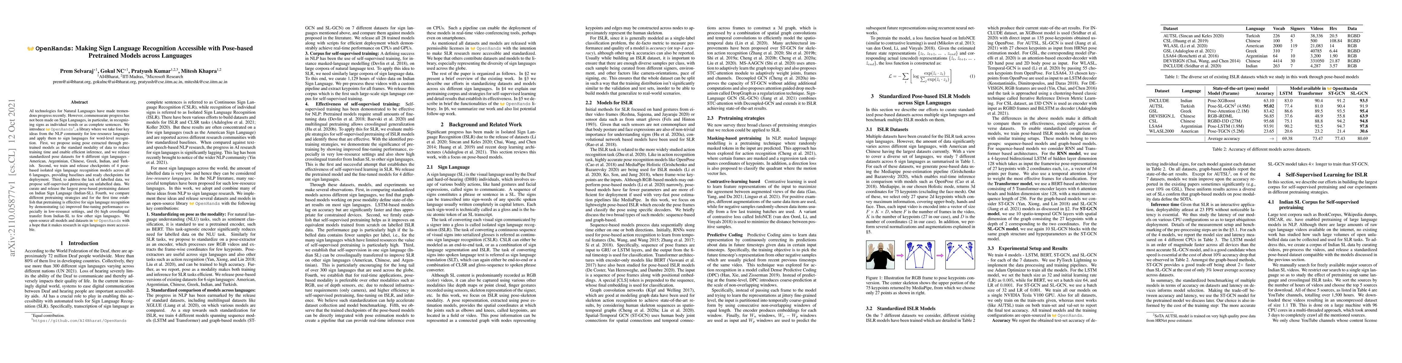 OpenHands introduces pose-based pretrained models for sign language recognition across six languages, utilizing self-supervised pretraining to address data scarcity and establishing effective crosslingual transfer. The project releases datasets, models, and pretraining strategies to enhance accessibility in sign language research.