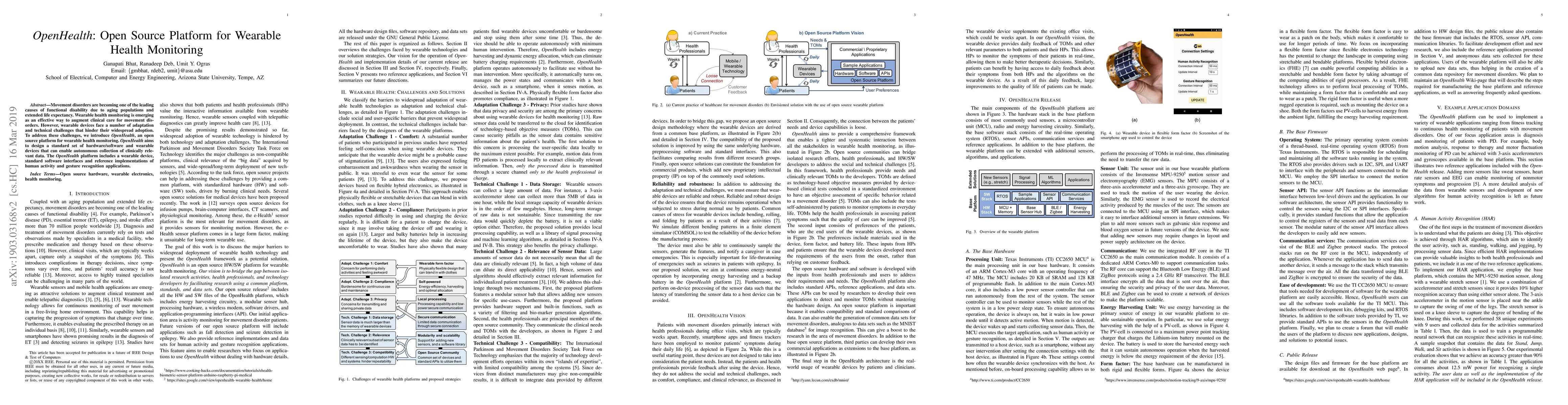 OpenHealth is an open-source platform designed to facilitate the adoption of wearable health monitoring for movement disorders by providing standardized hardware/software and applications for autonomous data collection. It aims to overcome technical challenges and enhance the clinical utility of wearable devices.