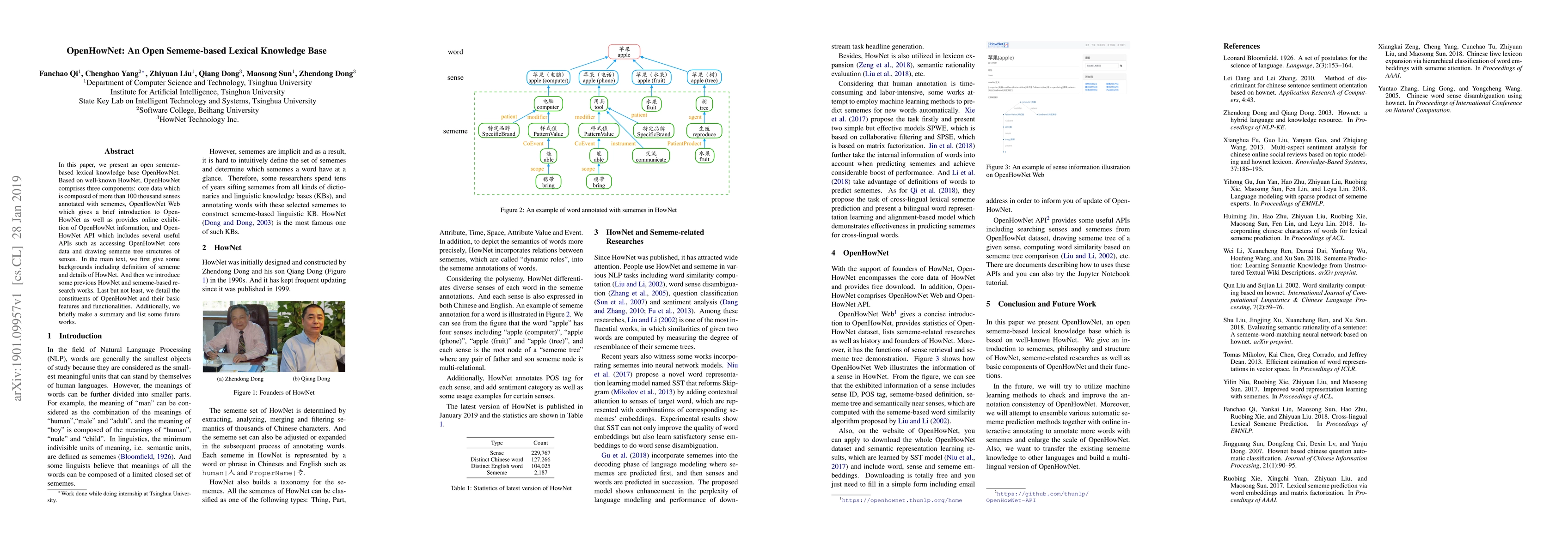 OpenHowNet is an open-source lexical knowledge base based on sememes, comprising core data, a web interface, and an API. It provides extensive sense annotations and tools for accessing and visualizing sememe structures, with a focus on future enhancements.